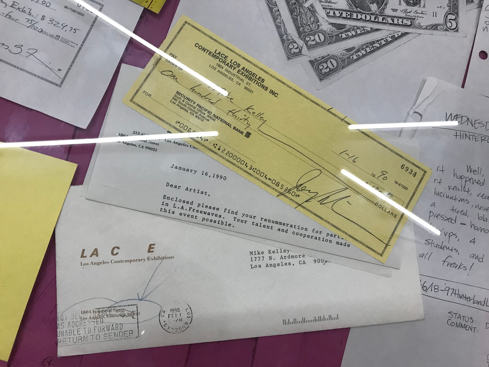 Flyers, pamphlets, invitations, and calendars make up a large part of the archive, and reflect the vision of the many artists and designers who were part of LACE, like a series of printed materials from the ’90s created by graphic designer Jeff Keedy. Old invoices, grant applications, and fundraising appeal letters also provide snapshots into the organization’s financial history and the relationships between people that helped sustain the organization over time. A $150 check — a small amount even in 1990 — made out to the artist Mike Kelley and later returned in the mail may amuse some visitors given his later status as a blue-chip artist.