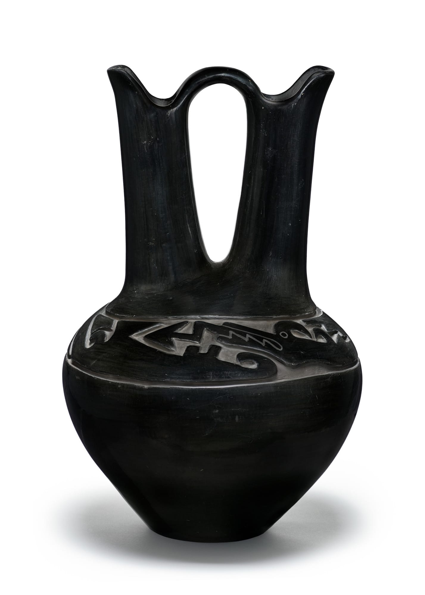 Also included in the Reiter Family donation are a group of pots from neighboring Indigenous peoples of the Southwest, including the Santa Clara Pueblo, known for its polished blackware and red polychromic pottery. A wedding vase by 20th-century Santa Clara artist Margaret Tafoya is adorned with a deep relief carving of the Avanyu serpent, the Tewa guardian of water.