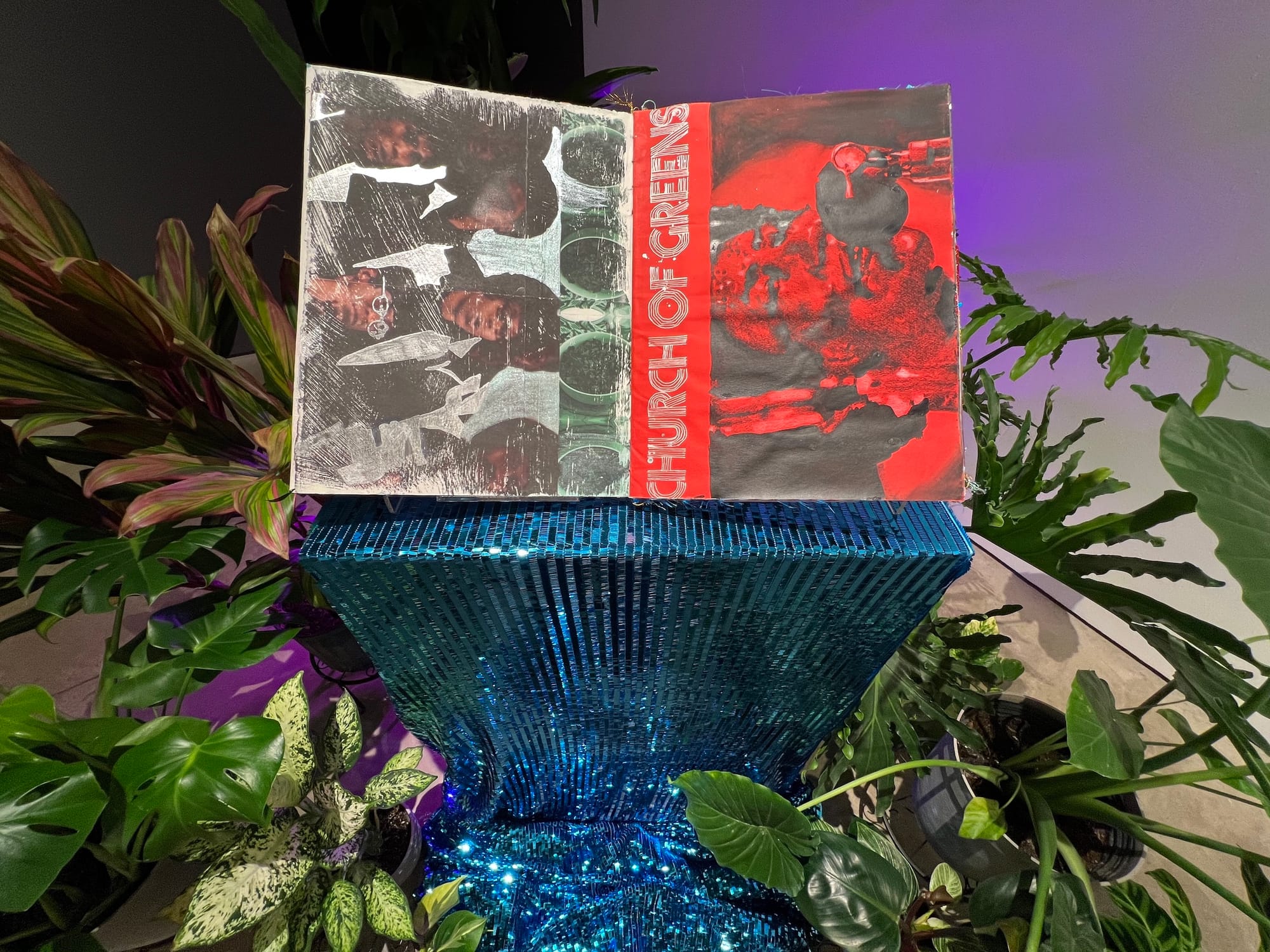 Inside the museum, viewers see April Bey’s glittering “Welcome to Atlantica (Hotel Room Planet Guide),” a 2019 artist book conceived as a guide to a mythological place where Black culture thrives, and Safwat Saleem’s “Concerned but Powerless: Rough Translation” (2023), a digital video in which the artist talks with his young daughter about words and concepts related to xenophobia. Behind the museum, one of Anna Tsouhlarakis’s (Navajo, Creek, Greek) billboard vinyl pieces from the series The Native Guide Project (2019–ongoing) faces an arts district marketed as a hub for Native art, where it challenges stereotypical views of Native American people while driving narratives of the future. Minimalist black text reading “IT’S GREAT HOW YOU ACKNOWLEDGE THAT NATIVE AMERICANS ARE STILL HERE” counters popular assumptions about the aesthetics of Native art while questioning art world practices related to land acknowledgments.