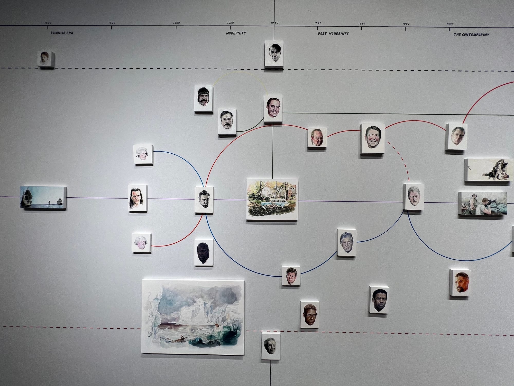 William Powhida’s “Possibilities for Representation” (2020–ongoing), an expansive watercolor and gouache installation comprising a timeline of the United States' political history and several imagined futures, speaks to the existence of propaganda across time with an elegant mix of history and humor, conveyed in part through images culled from the overlapping realms of politics and pop culture.