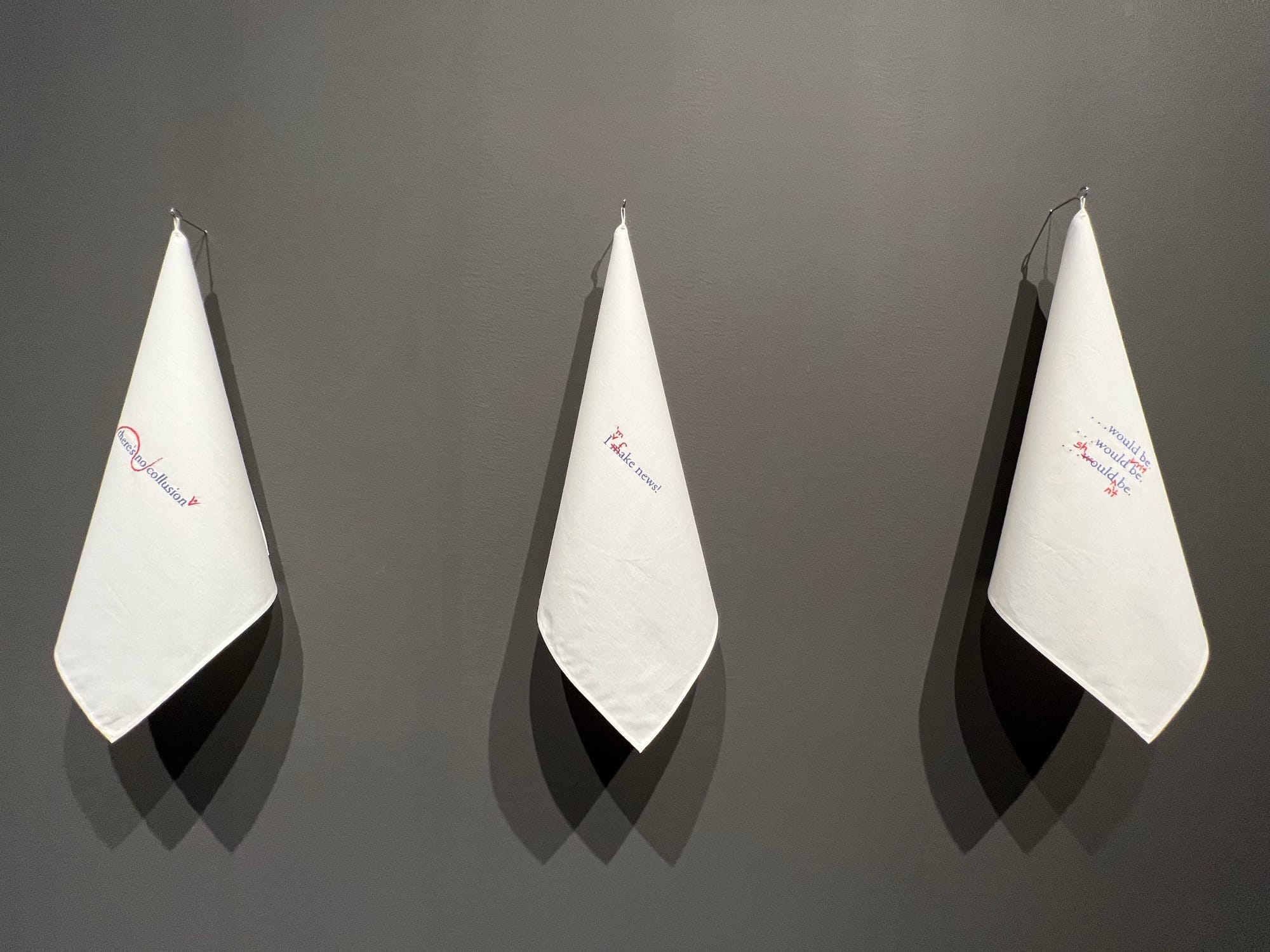 On one level, the exhibition serves as a guide to recent political strife: Ann Morton’s embroidered Proof-Reading series, for example, was prompted by the outcome of the 2016 presidential election, its editing marks cleverly changing the meanings of some of the former president’s most divisive declarations.