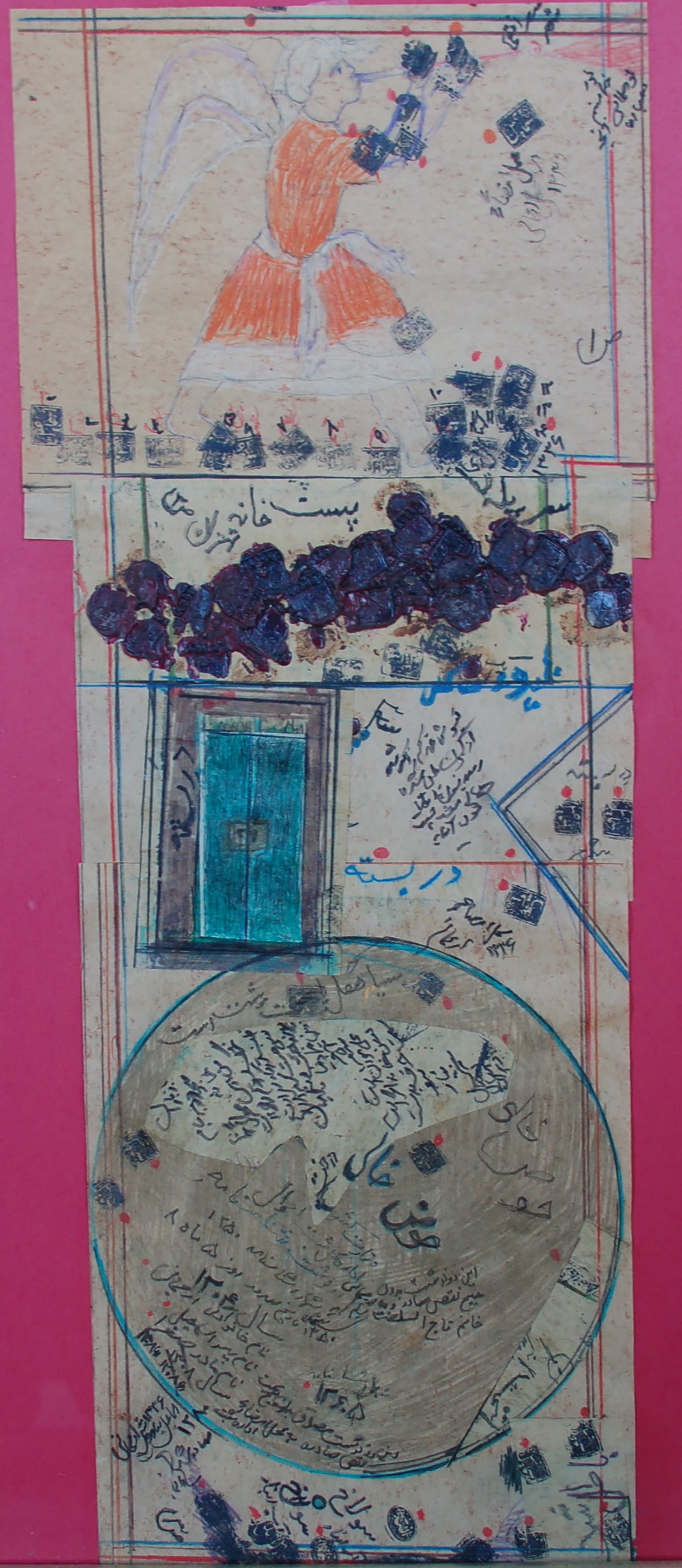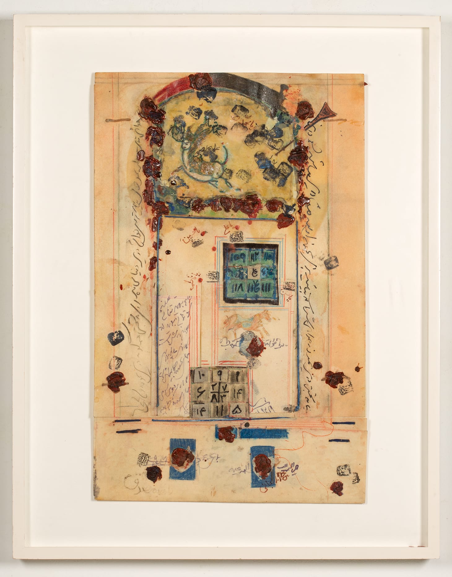 It was amidst this silent darkness that Armajani created “The Way” and “Songs #1 and #2.” Formally, the works echo the composition of the pages of medieval Islamic manuscripts — with their upper and lower registers, borders demarcating columns of text, and accompanying pictorial imagery. But in Armajani’s works the order of the page is subverted, the composite parts placed spontaneously, the script rendered in a hurried khatt-e shekaste used for ordinary affairs rather than the elegant nastaliq used for important documents. Seal wax is dripped in gestural manner across the page, with overlapping imprints from a signature stamp. Armajani often uses the signature stamp of his family in his artwork. The texts point to a heady political moment in Iranian history but also reference the disenfranchised and the down-trodden whose way of life, customs, and beliefs were marginalized by cultural elites.