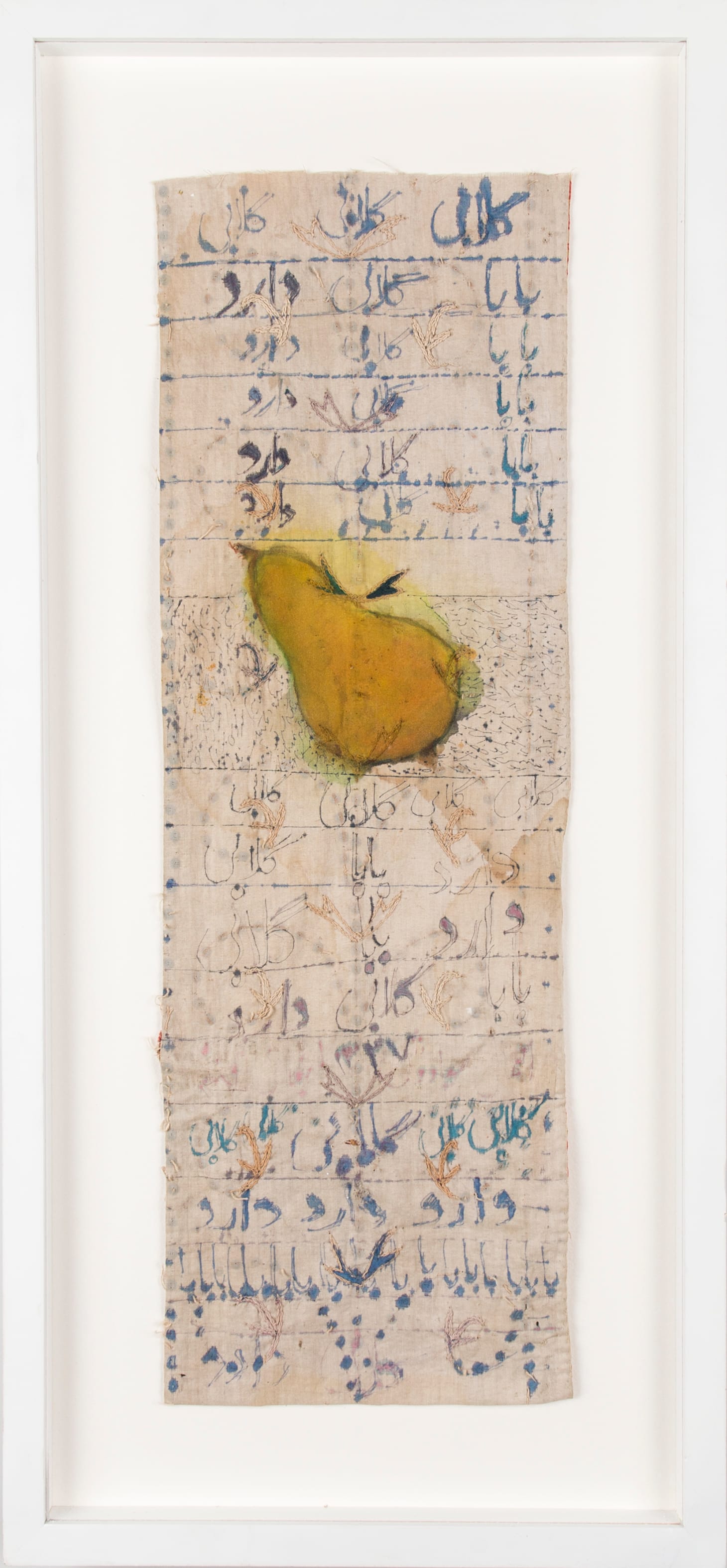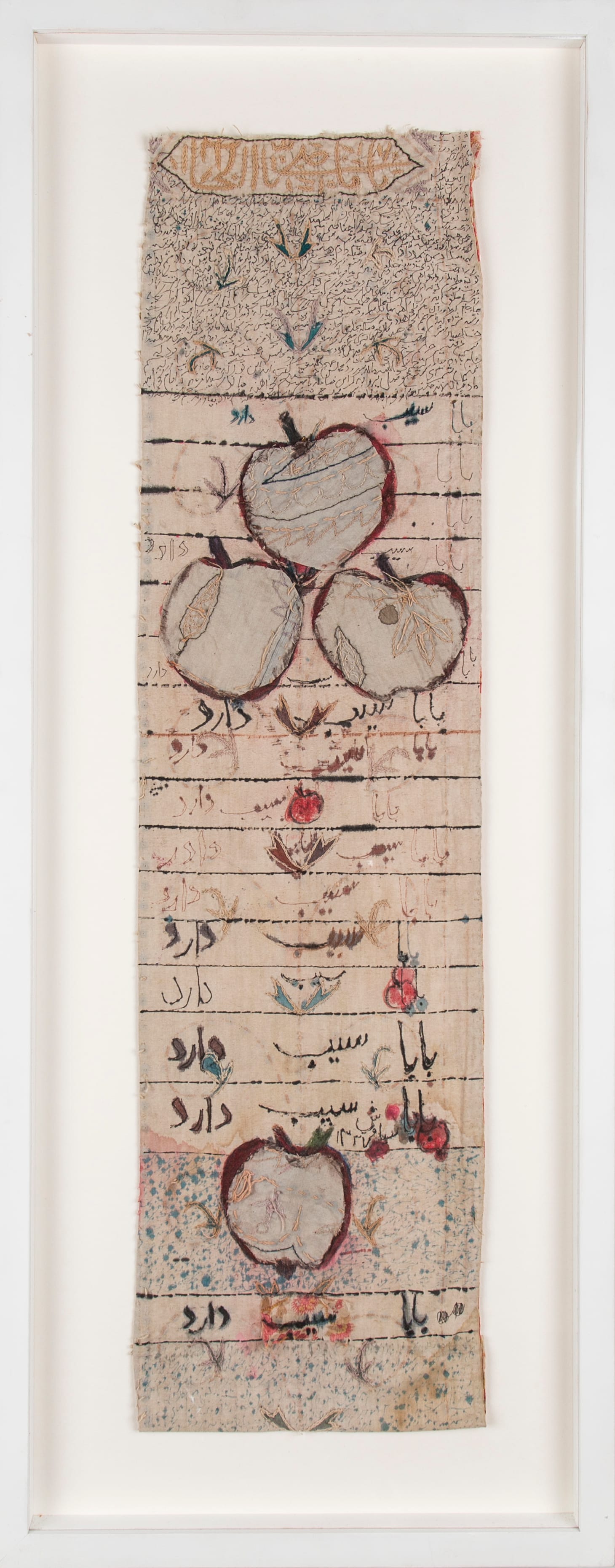 Armajani responded to his education through art. In school, he would learn how to read and write by repeating variations on these two sentences: “Maman nan dad. Baba ab dad/Mother gave bread. Father gave water.” Armajani remembers that, “we had to write words, again and again, one underneath the other.” In his early work he reflects on this, referencing that kind of rote learning, pervasive in Iranian schools. The paintings above also have a deeply personal meaning. Armajani shared this story during our visit at his Minneapolis studio in the summer of 2014. As a young boy, Armajani took private art lessons. Each week, he’d go to the instructor’s home and along with a small group of fellow students, learn how to draw and paint. The classes were tedious, with copying emphasized over creativity, realism over expressionism. One day, the teacher told the students to paint an apple. The young Armajani took a piece of paper, cut out the shape of an apple, and glued it onto a canvas. As Armajani showed his artwork to the class, his teacher grew furious. When Armajani’s father came to pick him up after class, the teacher complained bitterly that this young boy had no talent whatsoever and was a major disruption for the other students. “Art is not for him,” the angry teacher told Armajani’s father, who quietly nodded and agreed that he’d never bring his son back for lessons. As they headed back home, his father bent down to tell his son, that he was indeed an artist, one with a true gift. Soon after this incident, which Armajani recounts with great affection so many years later, he started rummaging through piles of textiles in their home. The old curtains that had once hung in the kitchen became the canvases for “Father Has an Apple” and “Father Has a Pear.”