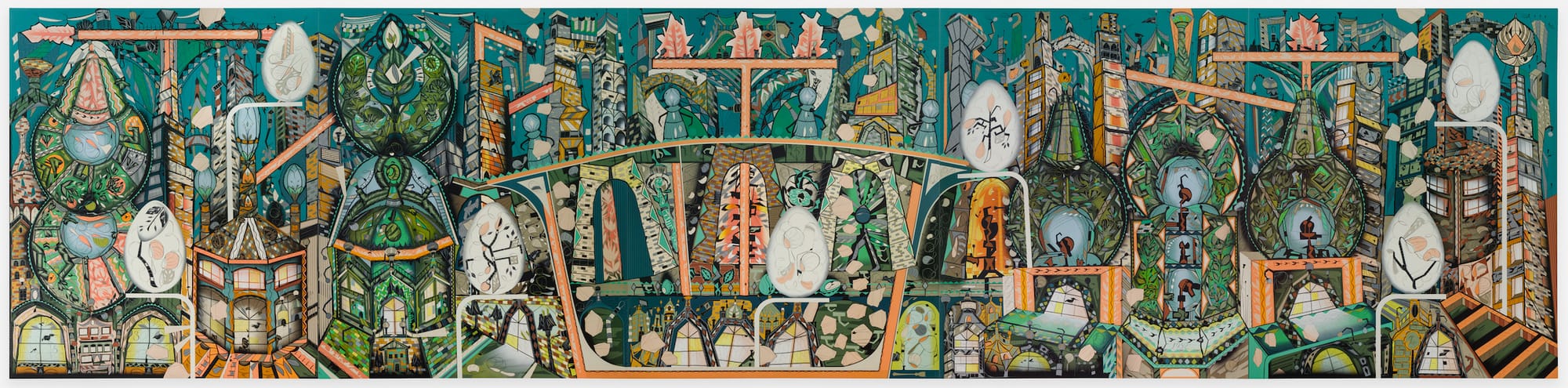 The centerpiece is “Sparkling City with Egg Monument” (2023), a spectacular 33-foot-long syncopated cityscape punctuated by several gleaming egg shapes. In a series of eight-by-six-and-a-half-foot canvases, the oval form takes prominence, with the city surrounding it. Smaller eggs are nestled within some of the larger ones, birthing further potentialities. A dynamic color scheme of mauve, yellow ochre, salmon, fiery orange, and various shades of green teeters on the edge of garishness while retaining coherence.
