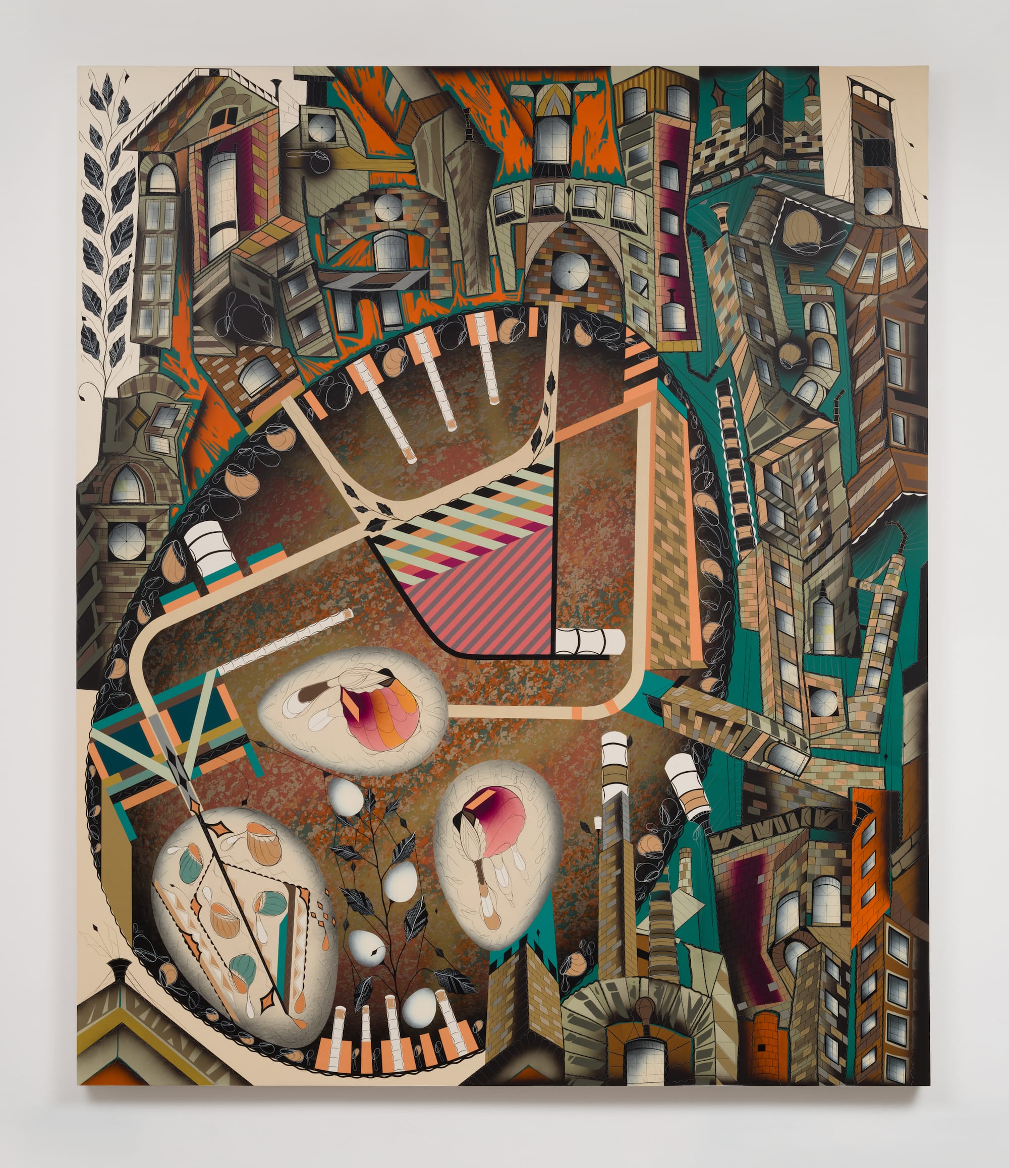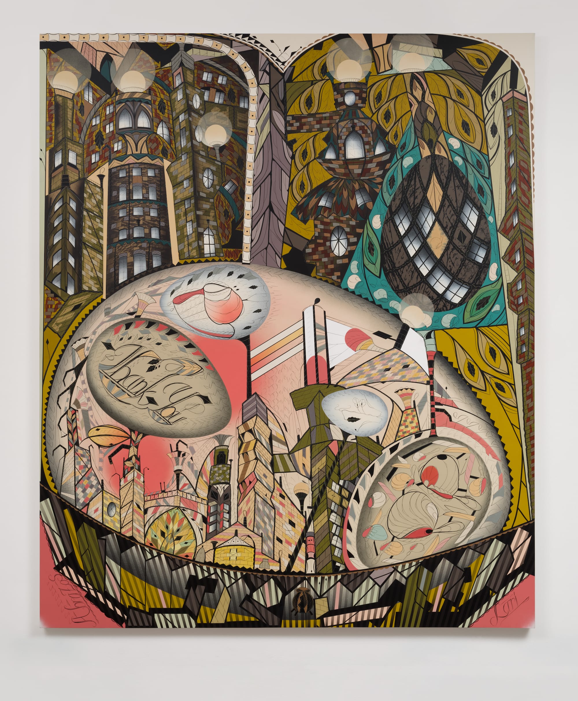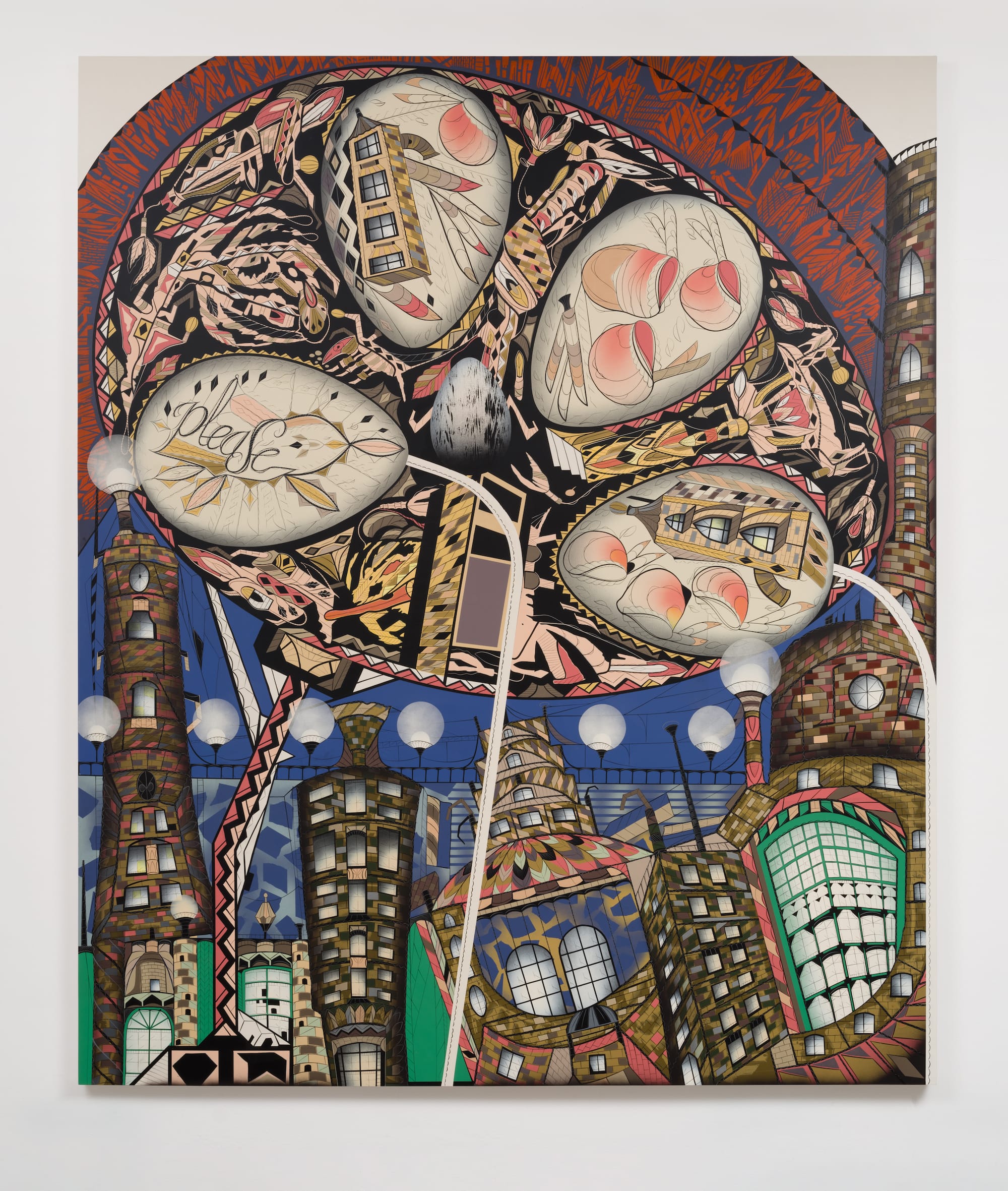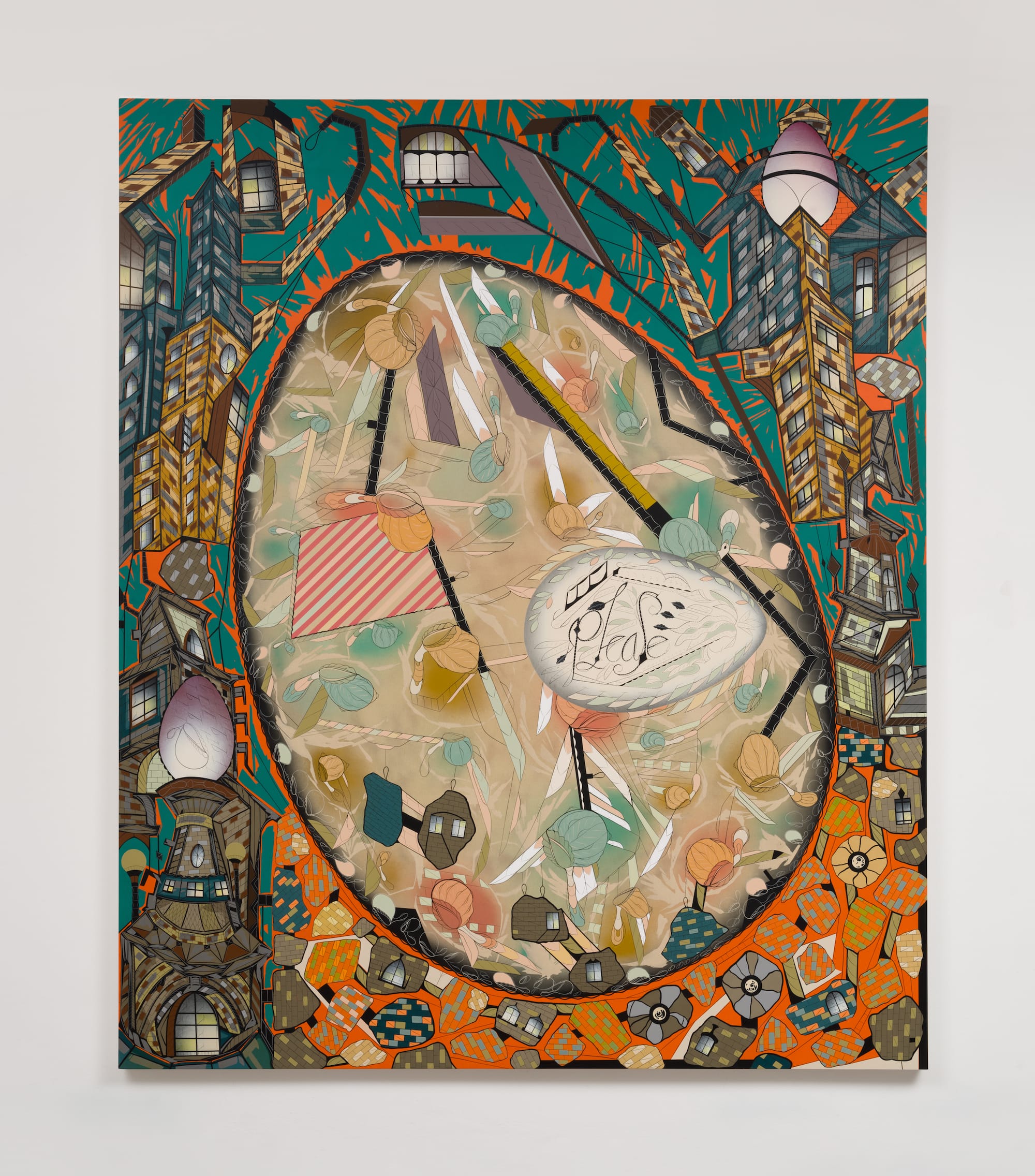 Pittman celebrates the cacophonous exuberance and hopeful potential of the urban experience in his upcoming exhibition Sparkling Cities With Egg Monuments, which opens next month at Lehmann Maupin Gallery in New York. The nine paintings in the exhibition depict imaginary fragmented city symphonies: soaring towers, tessellated brick facades, bridges, street lights, and abstracted roadways, joined together by dazzling fields of decorative ornament. Into these scenes, Pittman has inserted large “egg monuments” — ovoid forms that counter traditional phallic, grandiose memorials to captains of industry and war with symbols of open-ended, feminine possibility.