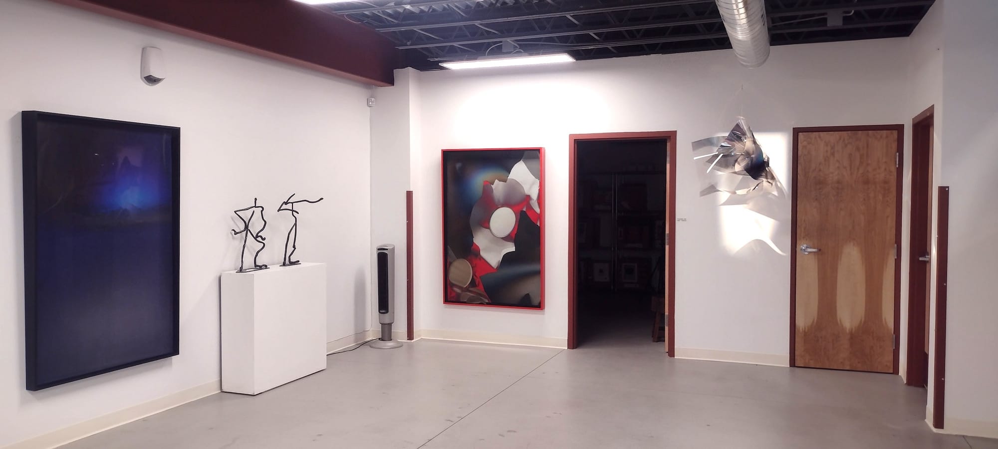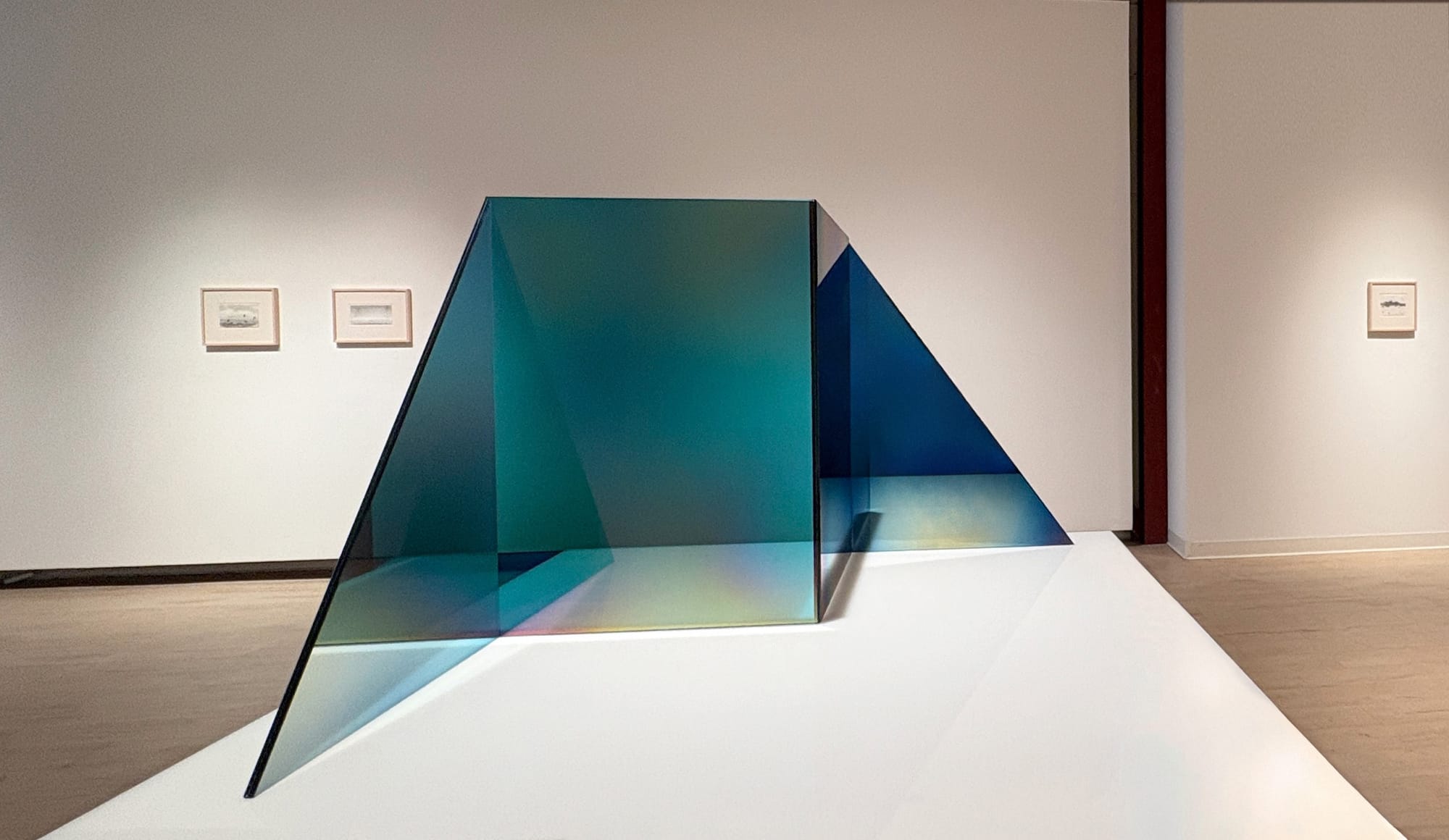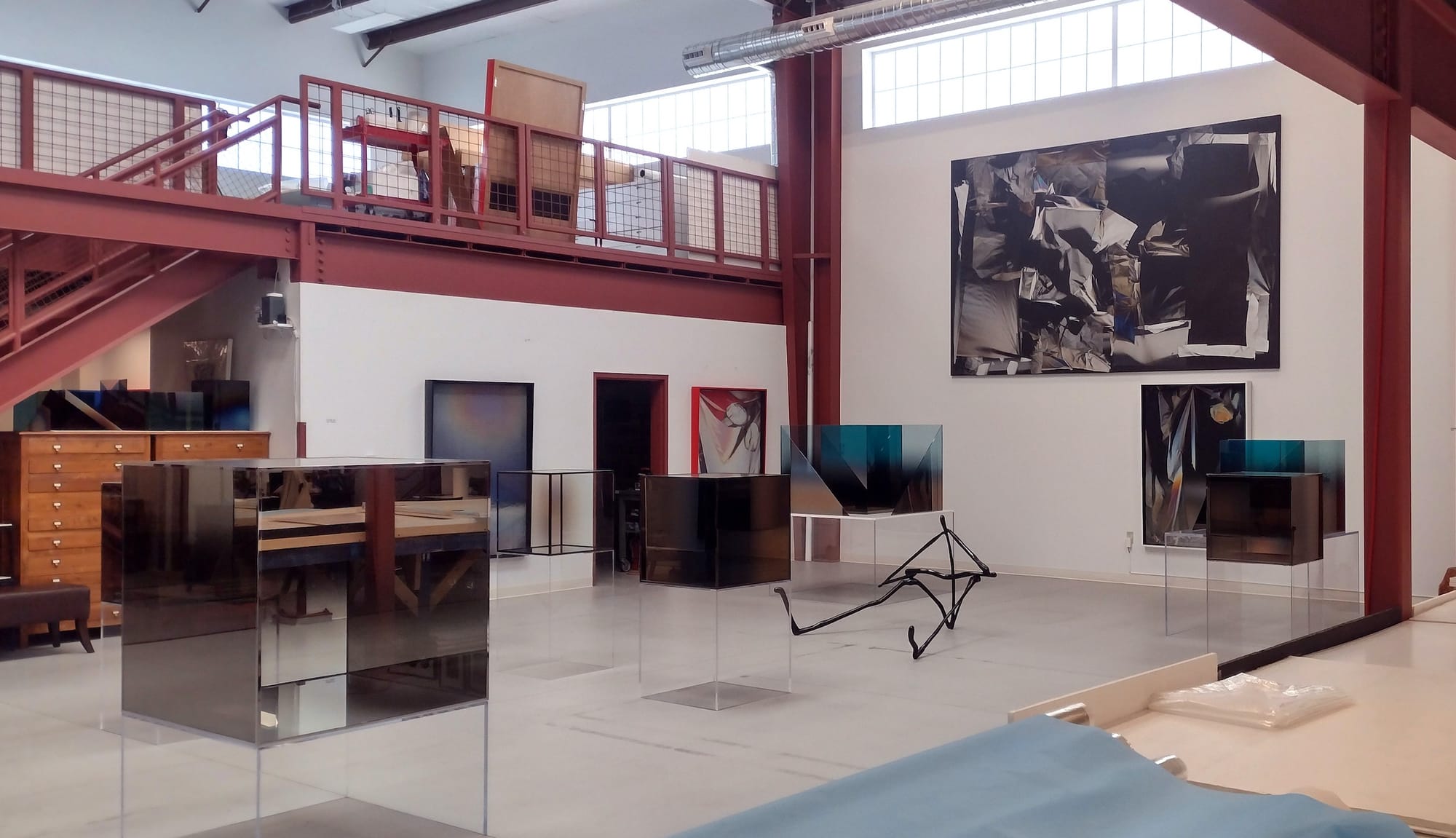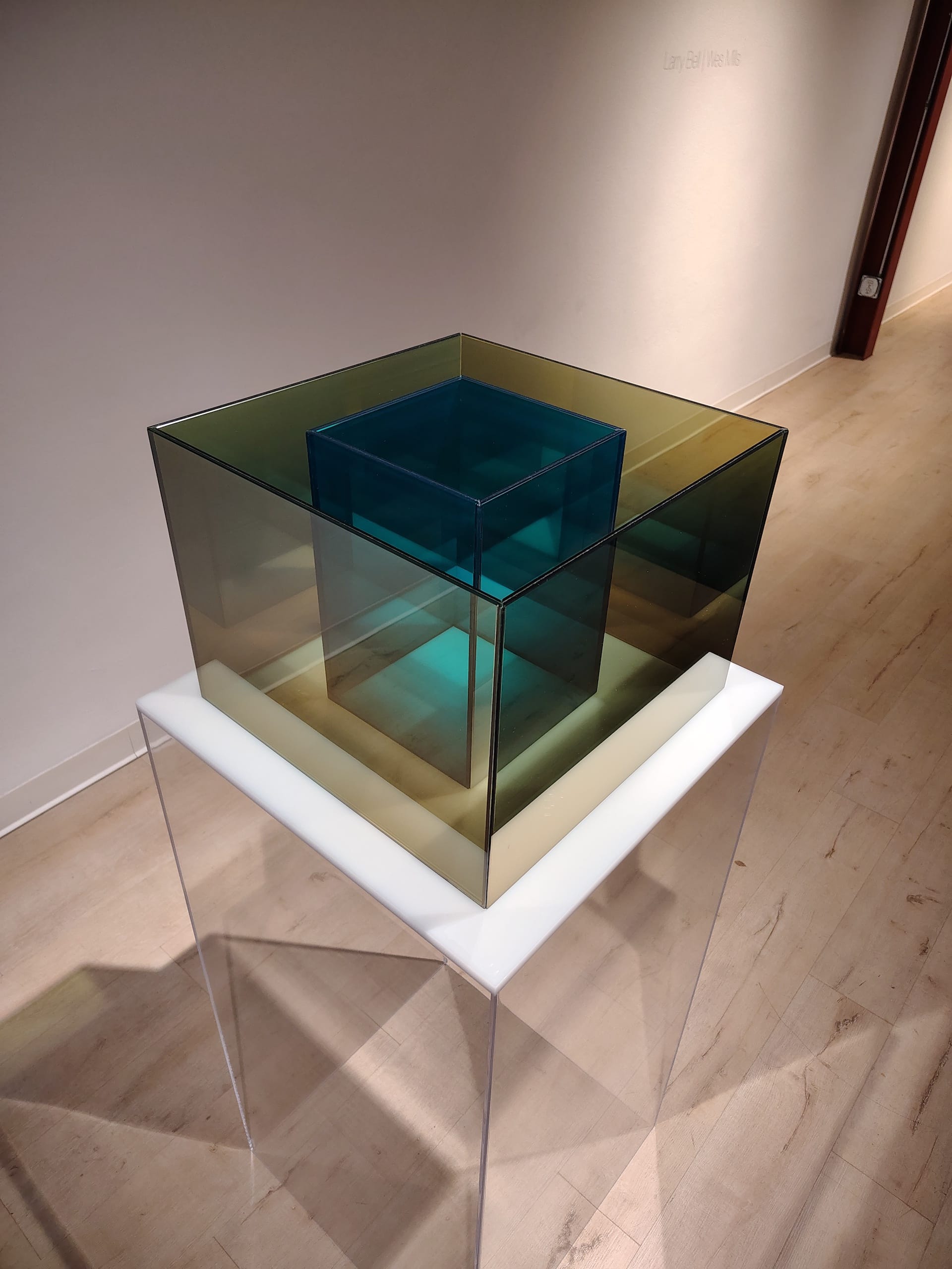 I make my way to the main area of the large, two-story industrial warehouse space, where a selection of the glass cubes for which Bell is well known are installed. The artist has been making art for nearly seven decades and continues to be a major figure in the Light and Space movement, influencing and inspiring artists around the world. He explains that his creative process relies on improvisation, intuition, and trust, with his decisions guided by spontaneity. “Improbable” is his favorite condition with which to engage.