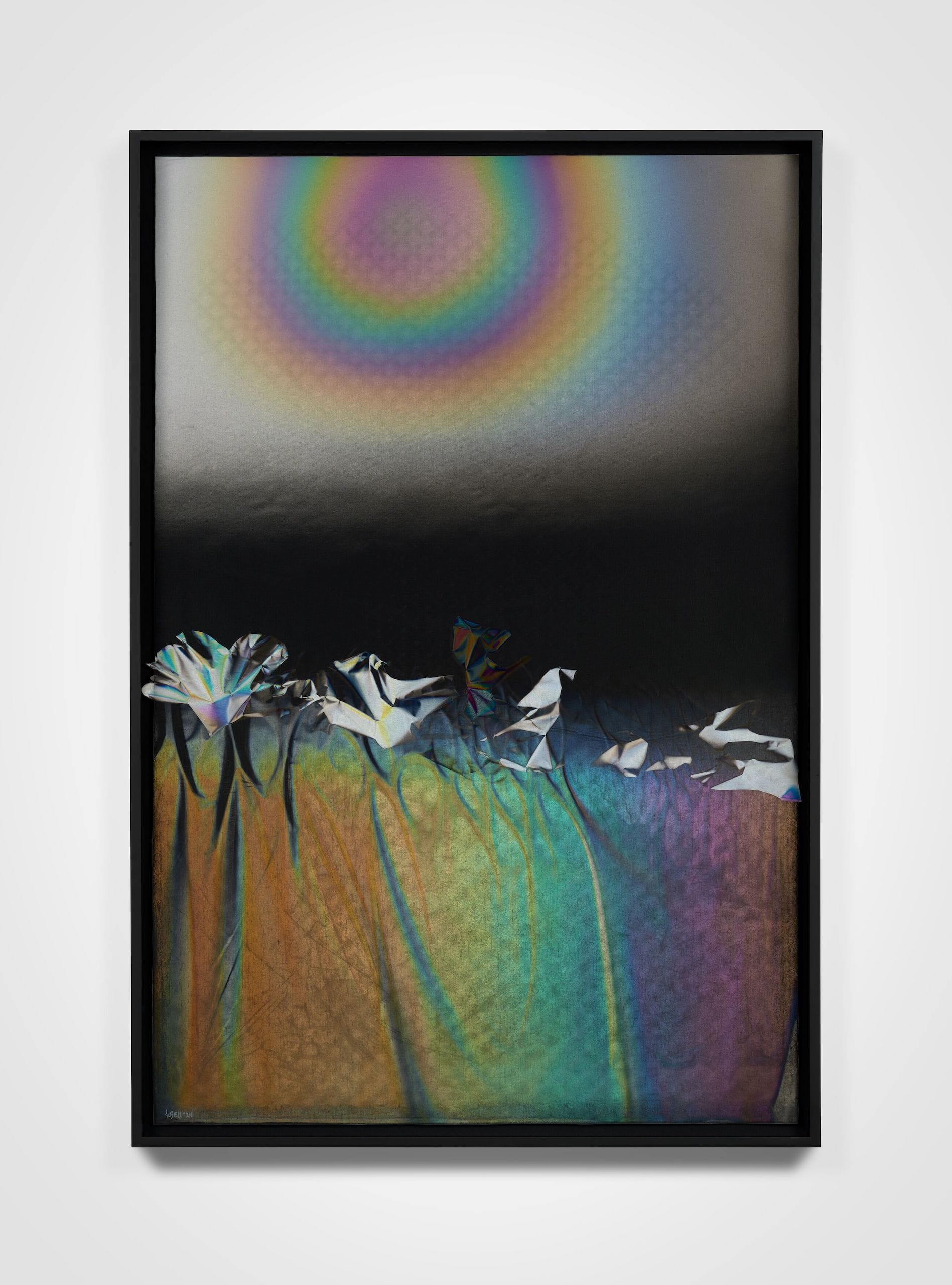 There's a lot of different material in the collages, such as canvas that's been gessoed, and laminated film that's been metallized with silicon monoxide. So the colors are actually light that is being reflected back at wavelengths equivalent to the thickness of the deposit. The texture started to intrigue me because I did not know how I did it. I knew what I put down and laminated together to make up the imagery, but not the surface. I was chasing the surface, trying to figure out why it did what it did. I haven't figured it out yet. When we put one next to the other, there seems to be a narrative. There's some kind of story that they're telling.