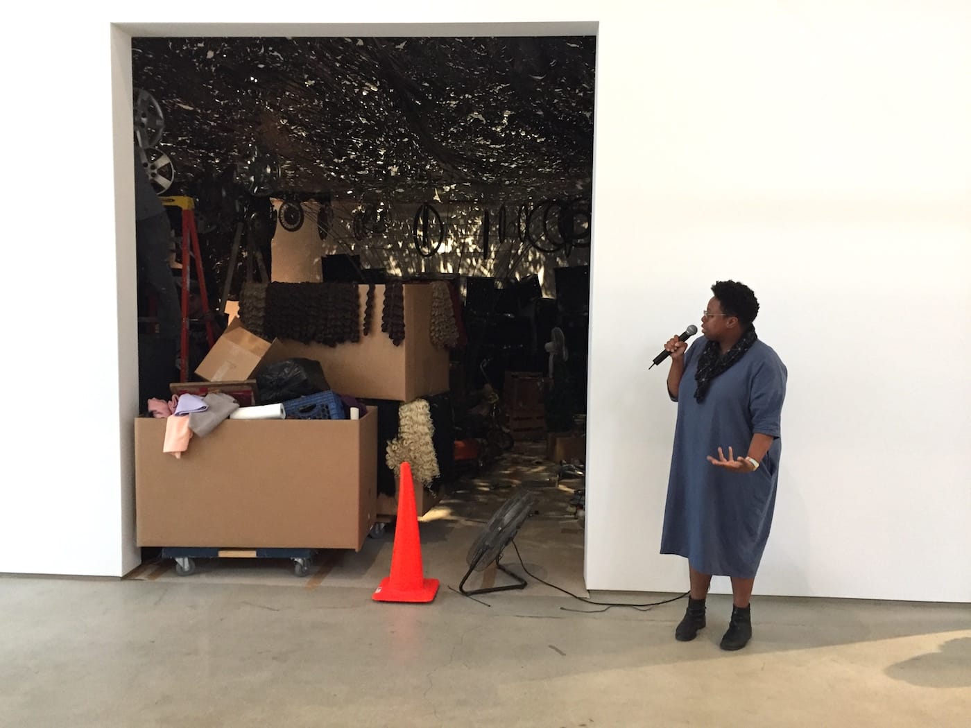 Also on view are two projects by contemporary artists that explore similar terrain as Ramírez, though in quite different forms. In an intimate project room, Abigail DeVille and a team of installers were feverishly working to complete her installation “No Space Hidden (Shelter).” The piece features hubcaps, garbage bags, mannequins, and debris collected from junk yards and swap meets, all swirling around a central steel armature and covered by a perforated tarp. “Something that’s been a continual point of conversation throughout the arc of her career is this idea of cultural erasure, invisibility and migration, people being pushed to margins of society,” explained the ICA LA curator Jamillah James. Referencing nearby Skid Row, which James notes is the geographic center of LA, the work arranges the collection of urban debris into an engaging but impenetrable cosmological map.