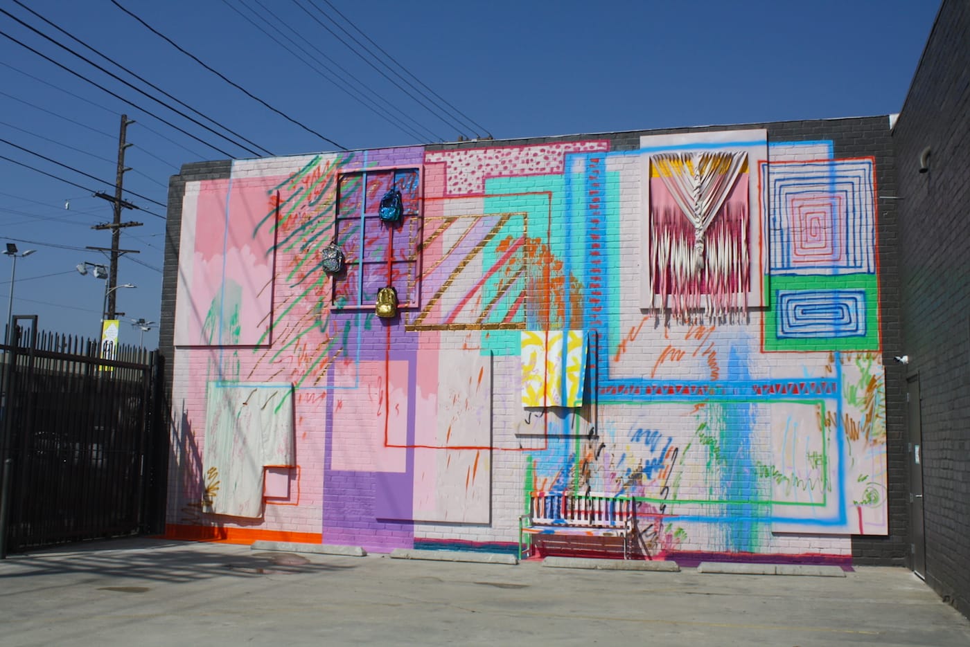 Outside the ICA LA, on the interior wall of its courtyard, LA-based artist Sarah Cain’s brightly colored mural titled, “Now I’m going to tell you everything,” attempts to link the landscape of the street with that of the gallery. Cain incorporates three-dimensional elements like backpacks, canvases, vinyl flooring, and a bench, with painted allusions to abstraction and graffiti. Although visually animated, the ambitious mural ultimately ends up being less than the sum of its parts, trying to do too many things without fully succeeding.