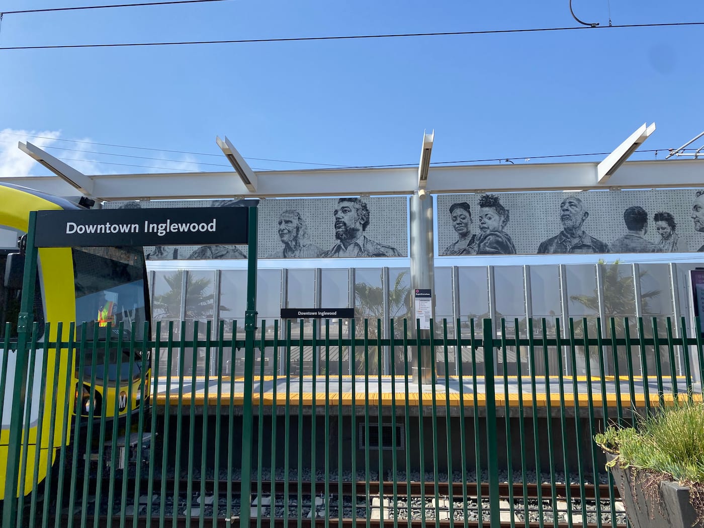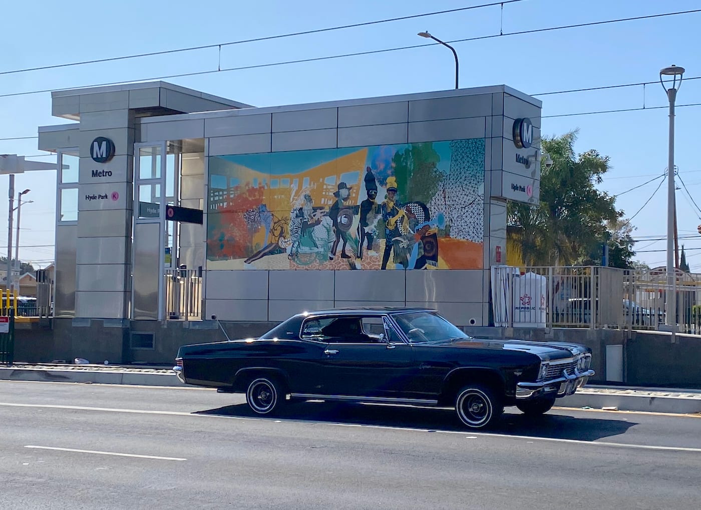The K Line art program began eight years ago with an open call for proposals, with winners selected by a panel of community-based arts professionals. Still, the K Line itself has been called “a blessing and a curse” by community residents, who are wary of its role in spurring development and gentrification. Frustration that the entire route is not underground (the Northernmost three stations are below ground; the other four are at grade) was partially behind the creation of Destination Crenshaw, a series of public artworks touted as a “reparative development project” to counter the K Line’s disruption.