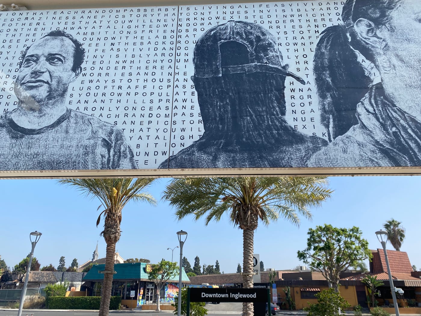 To create “Sonder” at the Inglewood Station, Kenturah Davis held an open call for people with connections to the neighborhood from which she made several portraits. About two dozen of these are reproduced on the black-and-white porcelain enamel panels that adorn the above-ground station, portraying a diverse group of individuals sharing the same space but leading separate lives. “I was thinking about public transit as a site for encountering strangers,” says Davis, who was raised in Altadena but grew up attending church in South Central.