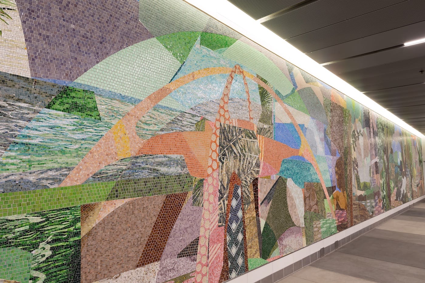 Rendered in mosaic, porcelain enamel, or glass panels, the station artworks display a range of styles and subject matter; however, all reflect and respond to the communities around their specific sites. For Ingrid Calame’s “Talking Drums” at the Leimert Park Station, the artist collaborated with William Watters and Jasmine Morgan of the RightWay Foundation, a nonprofit that offers support to foster youth. They made rubbings of architectural details, bicycles, and drums in the surrounding area, then collaged those rubbings onto brightly-colored glass panels framing the station’s entrance.