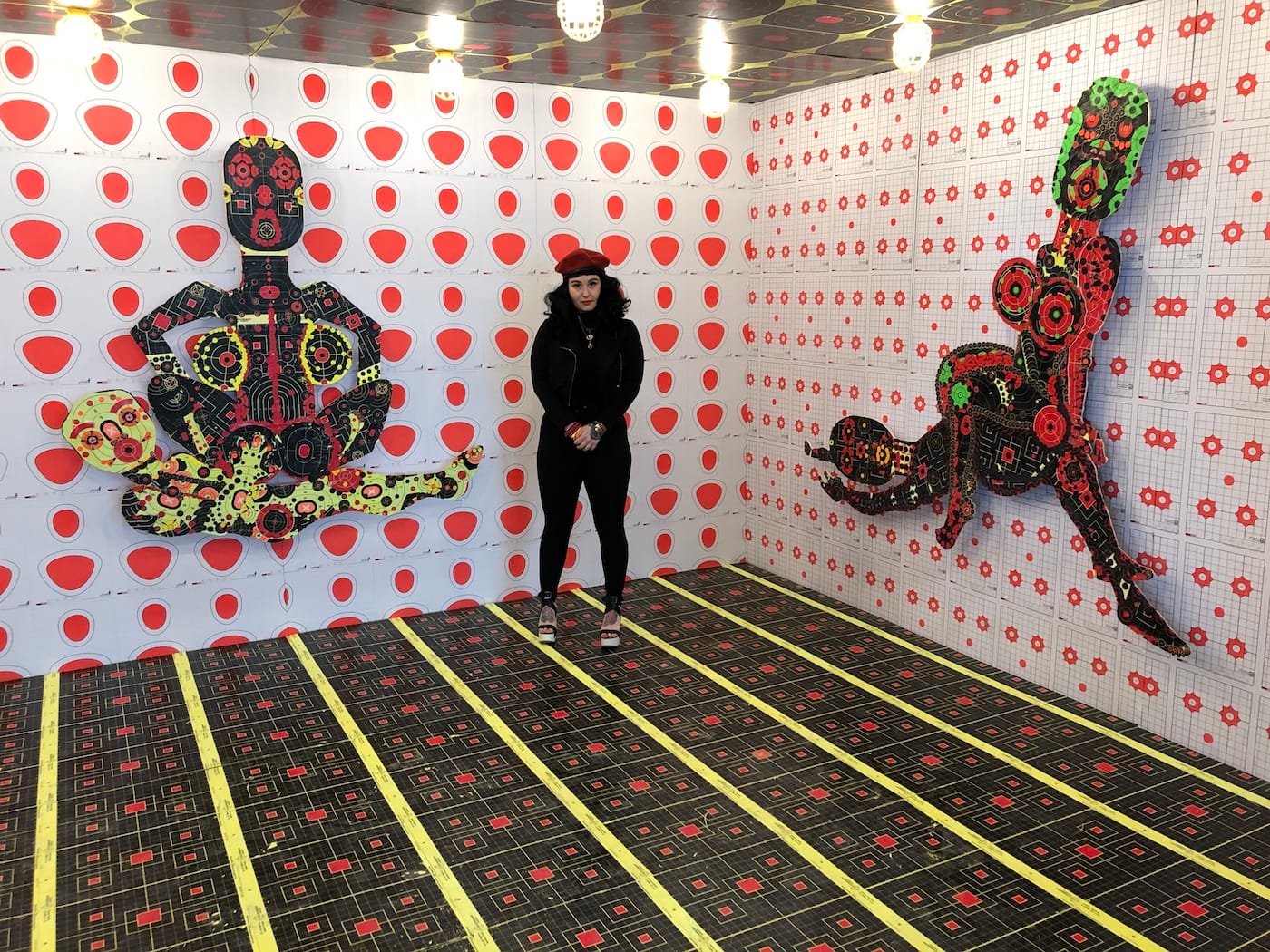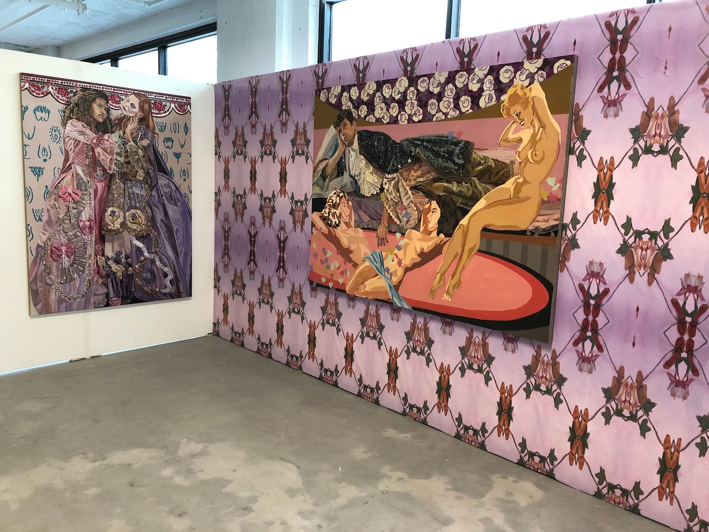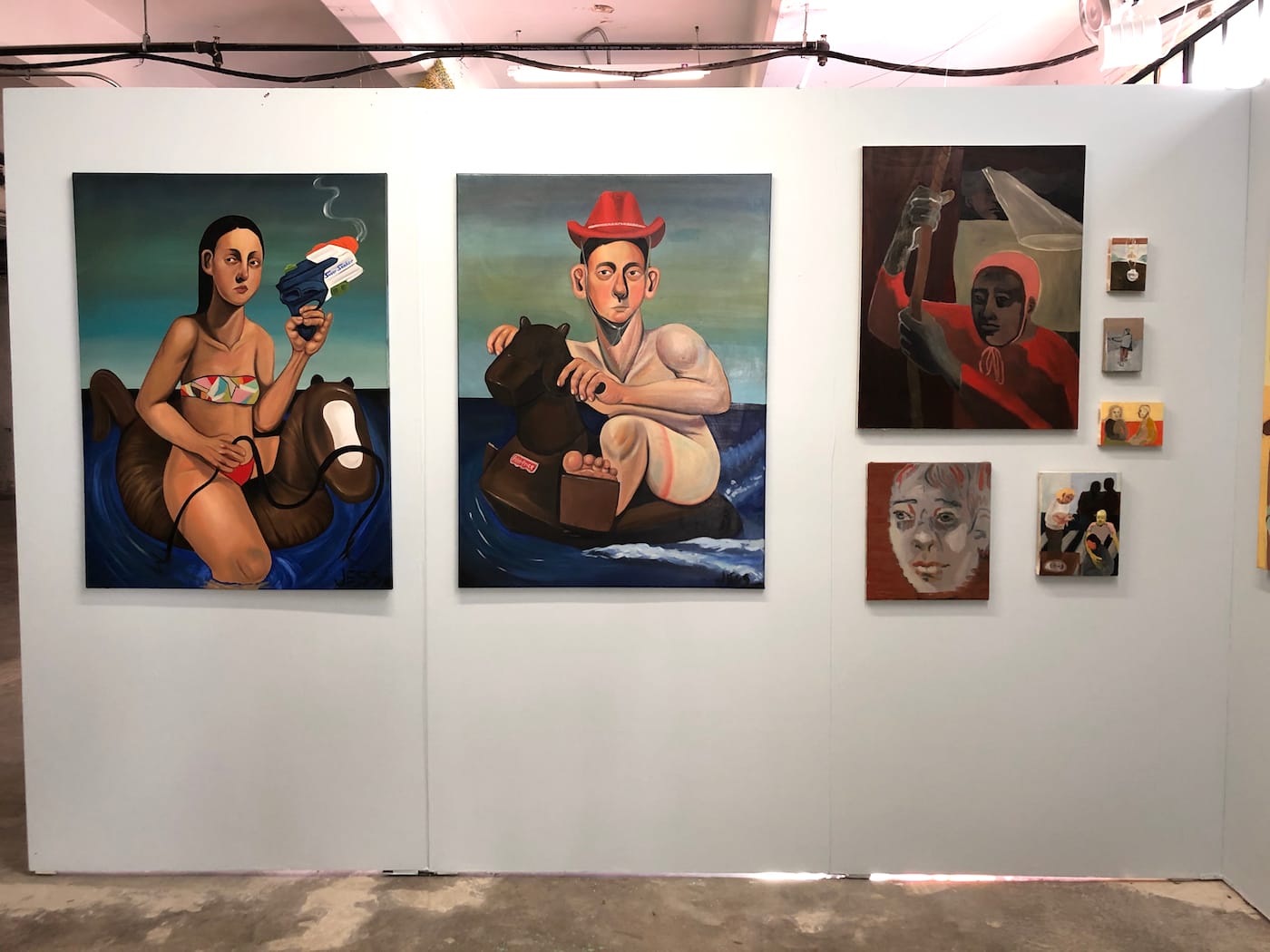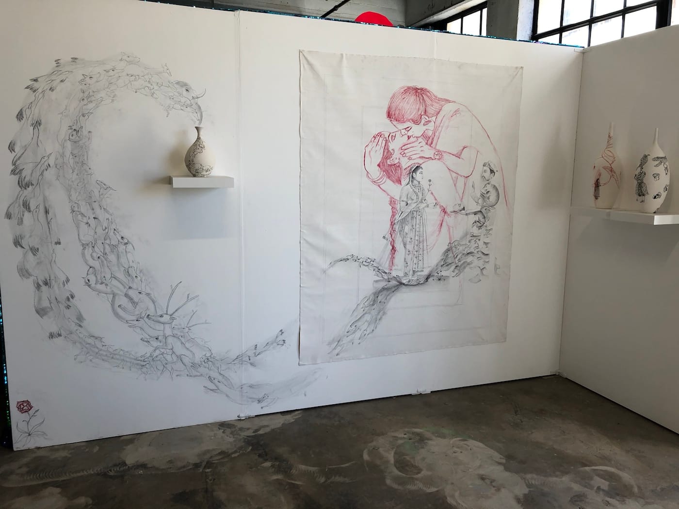 Gas Gallery founder Ceci Moss and Rosie with work by Louise Rosendal (wallpaper), Nikita Gale (lettering), Dahn Gim (left sculpture), Natani Notah (center sculpture) for her show “Custom” focused on American car culture.Supercollider x Femmebit. Emma Akhakdjian’s installation made of marine debris rope and buoy at left.Lorna Mills at Transfer Gallery with her GIF version of Adam & Eve.Johanna Braun at Tiger Strikes Asteroid LA with her research-based installation on “climate hysteria”Sanie Bokhari (drawings) and Nicholas Oh (ceramics) curated by Sadaf PadderBenjamin Cabral’s hand-beaded wonderland curated by Lauren PowellMarina Heintze curated by Leila Jarman. Heintze fashioned ballistic targets into scenes of sexual congress.Nina Sarnelle at Black Cube. Sarnelle’s video installation examines the fallacy of municipal subsidization of corporations.Jonathan Rosen at Alessandra De Benedetti. Rosen’s mirrors flash thousands of digital phrases, one of which is captured for each selfie snapped.Paintings by Jess Valice and Katja Farin at Desert CenterPanni Malekzadeh at Superposition Gallery.Amanda Smith’s fantastical painted ceramics curated by Christopher LynnSteve Hash curated by Hilde Lynn HelphensteinThe duo Band Practice (Melissa Godoy-Nieto and Clara Claus) creates collaborative drawings.Kristin Cammermeyer. For their installation “Spring Cleaning,” Cammermeyer and Anna Breininger assembled a still life and invite visitors to sketch from it.Sarah Bereza and Fall on Your SwordAmy Silver’s drawings on drywall draw from Americana, Russian history, and fringe movements.