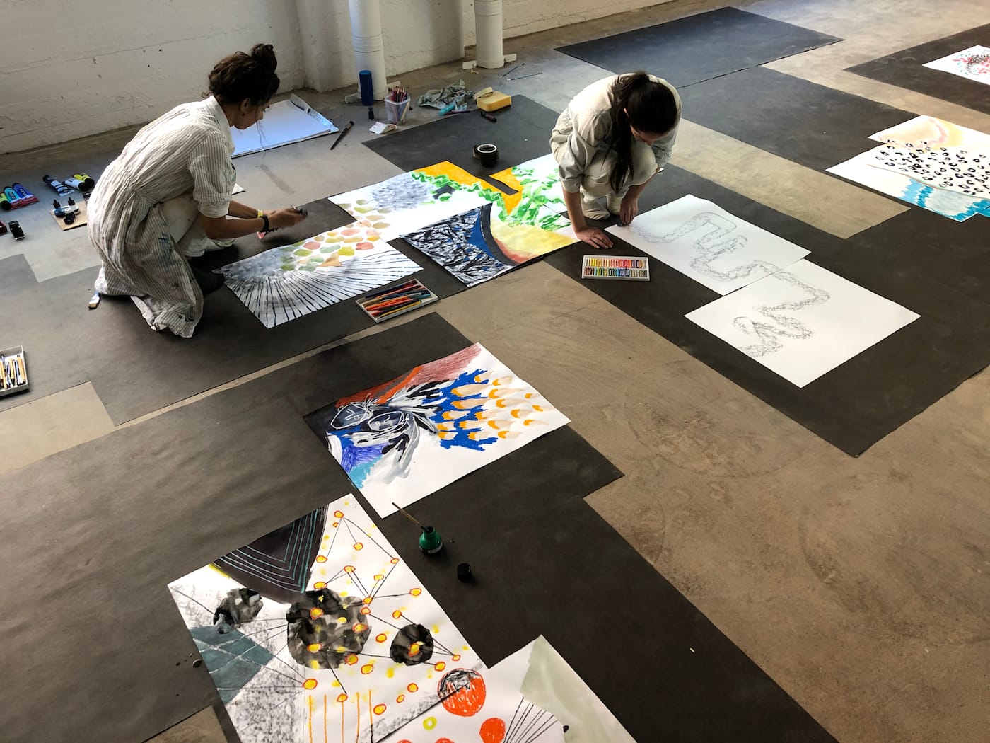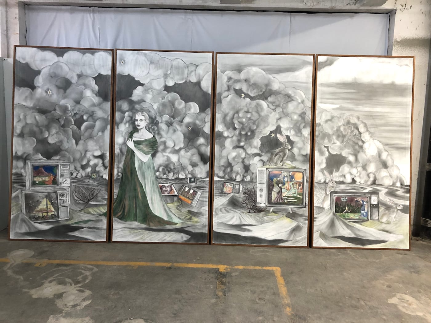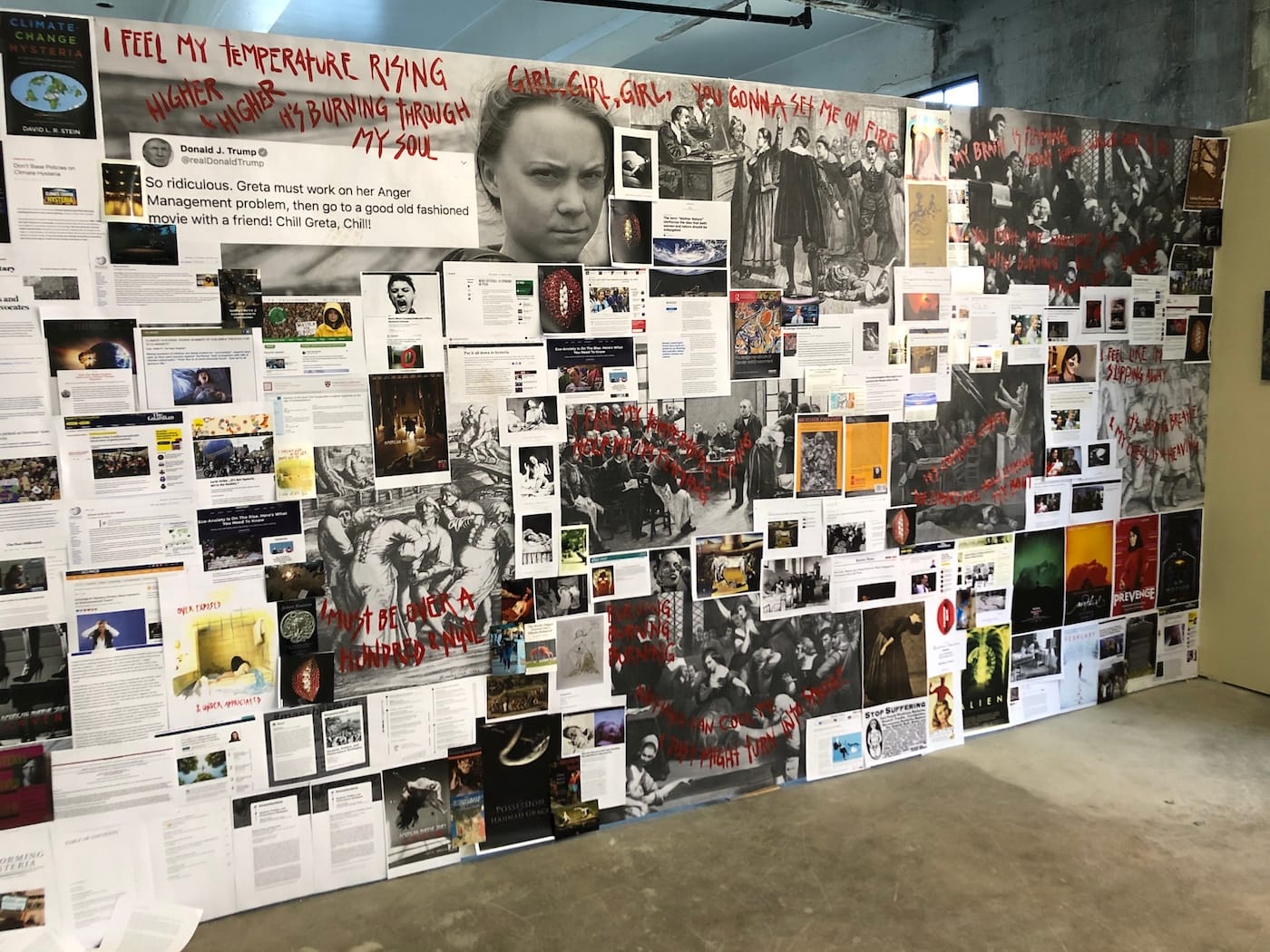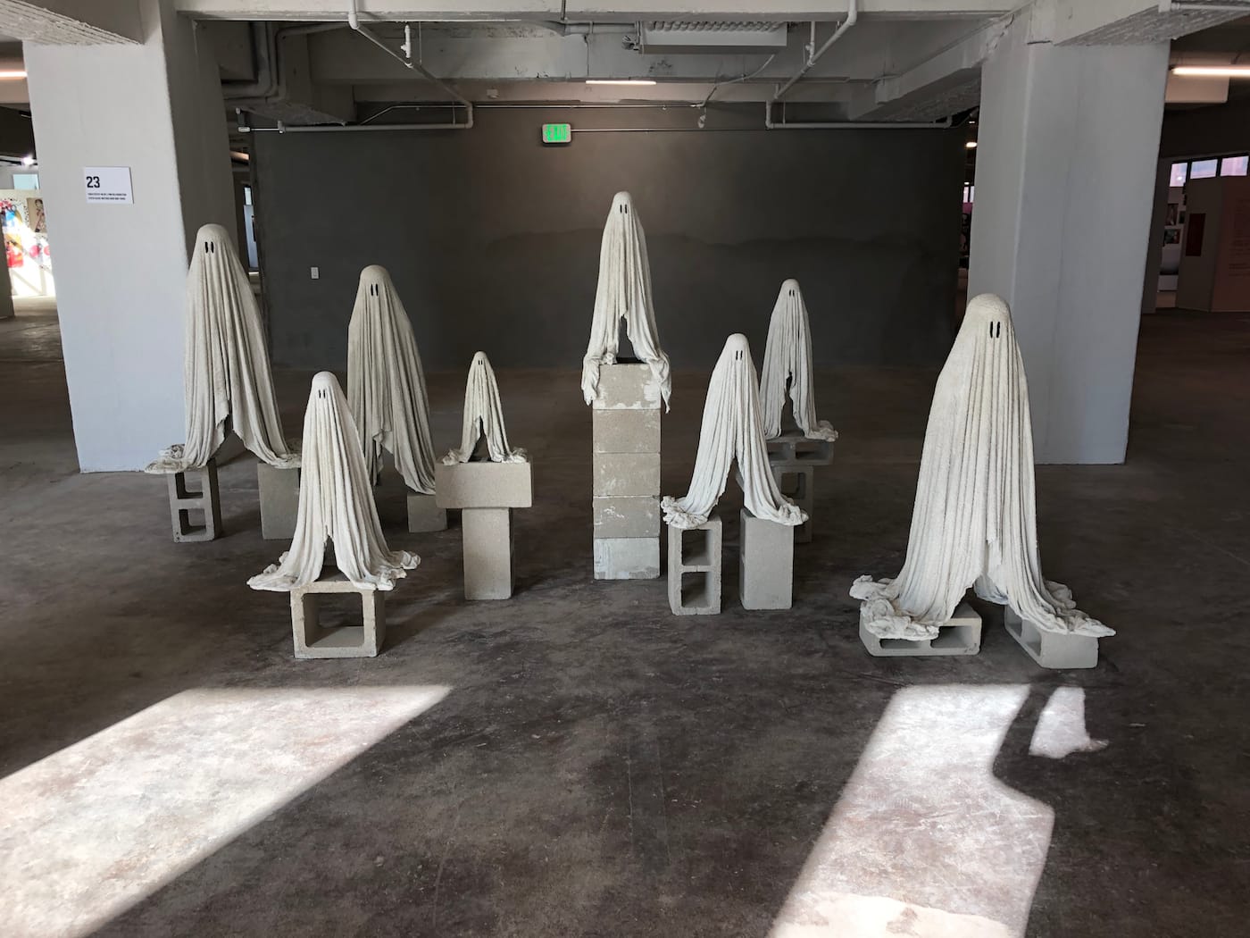 Gas Gallery founder Ceci Moss and Rosie with work by Louise Rosendal (wallpaper), Nikita Gale (lettering), Dahn Gim (left sculpture), Natani Notah (center sculpture) for her show “Custom” focused on American car culture.Supercollider x Femmebit. Emma Akhakdjian’s installation made of marine debris rope and buoy at left.Lorna Mills at Transfer Gallery with her GIF version of Adam & Eve.Johanna Braun at Tiger Strikes Asteroid LA with her research-based installation on “climate hysteria”Sanie Bokhari (drawings) and Nicholas Oh (ceramics) curated by Sadaf PadderBenjamin Cabral’s hand-beaded wonderland curated by Lauren PowellMarina Heintze curated by Leila Jarman. Heintze fashioned ballistic targets into scenes of sexual congress.Nina Sarnelle at Black Cube. Sarnelle’s video installation examines the fallacy of municipal subsidization of corporations.Jonathan Rosen at Alessandra De Benedetti. Rosen’s mirrors flash thousands of digital phrases, one of which is captured for each selfie snapped.Paintings by Jess Valice and Katja Farin at Desert CenterPanni Malekzadeh at Superposition Gallery.Amanda Smith’s fantastical painted ceramics curated by Christopher LynnSteve Hash curated by Hilde Lynn HelphensteinThe duo Band Practice (Melissa Godoy-Nieto and Clara Claus) creates collaborative drawings.Kristin Cammermeyer. For their installation “Spring Cleaning,” Cammermeyer and Anna Breininger assembled a still life and invite visitors to sketch from it.Sarah Bereza and Fall on Your SwordAmy Silver’s drawings on drywall draw from Americana, Russian history, and fringe movements.