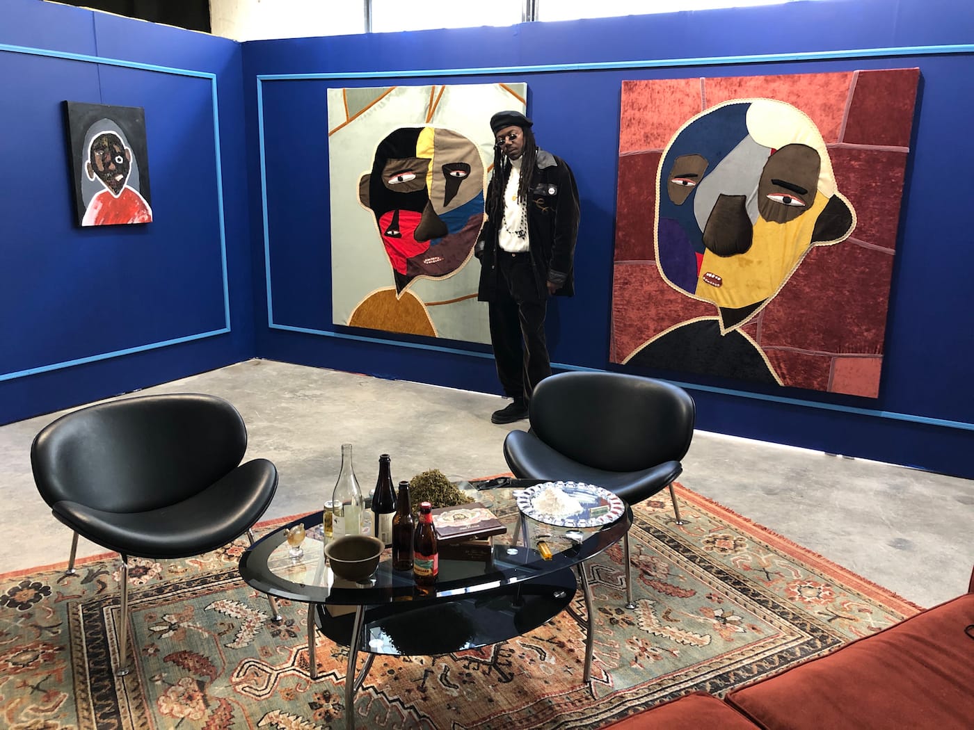 Working under the theme “In Excess,” participants put together maximalist, delightfully garish, and over-the-top installations that bring a marked contrast to the drab grey of the second floor industrial space. These range from New York artist Greg Haberny’s dozens of expressionistic painted and collaged paper plates, to David “Mr Starcity” White’s textile works and paintings in honor of those who have fallen victim to nightlife excess. The installation is completed by a table laid out with liquor bottles, and piles of (fake) cocaine and (real?) cannabis.