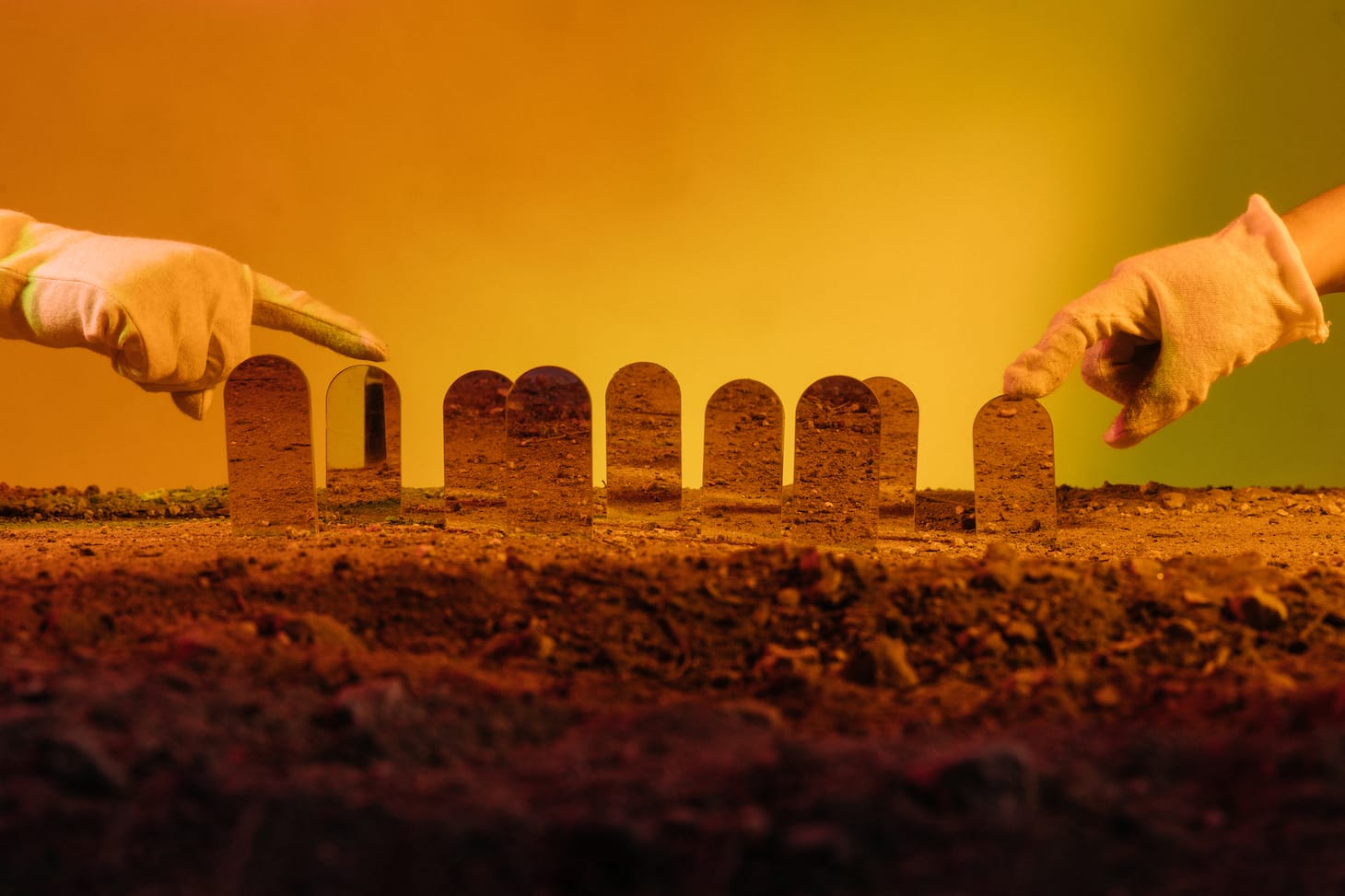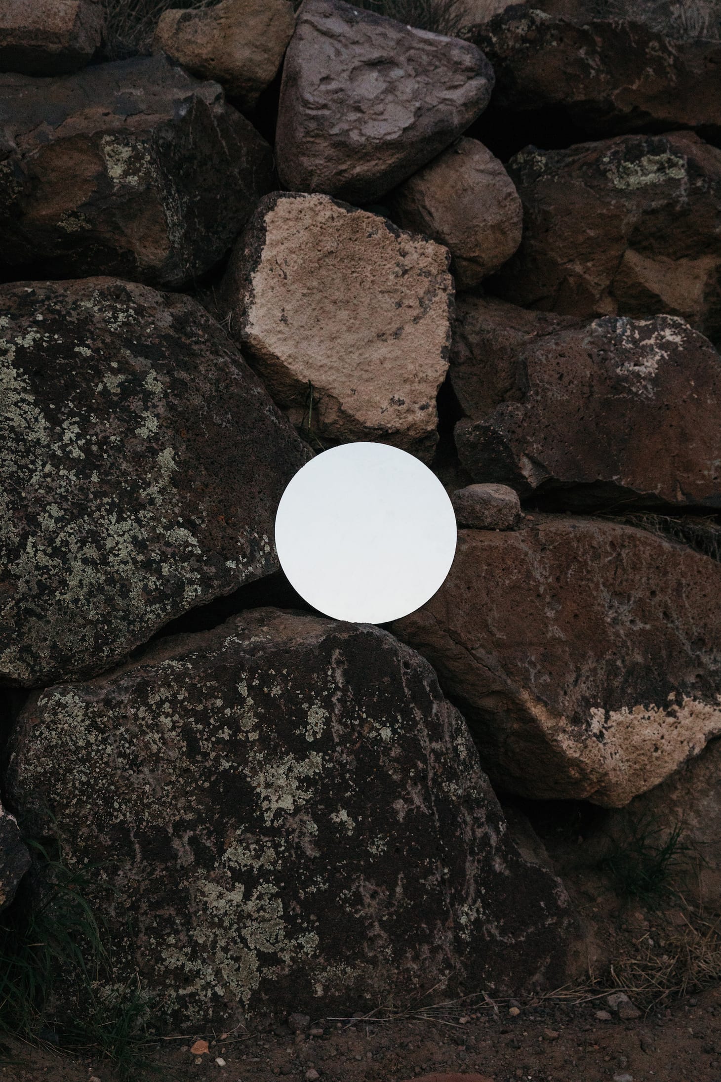 A combination of photography and installation, Whitmore’s exhibition showcases images of dazzling craft and understated observation, mixing photographed dioramas, like the iridescent cactus constructed from glass in “I don’t want flowers when I’m dead” alongside images of found objects. Running along the wall opposite these photographs are 10 pennant lines handmade from gold mylar. The recurrence of reflective materials as symbols invites questions concerning reality and distortion. In “Rock, Mirror, Cliff,” a circular mirror set atop dark boulders reflects a cloudless sky tilting towards sunset, and so seemingly reflects nothing at all, “a jumping-off point to infinite possibilities.” In “Seven Years of Bad Luck,” among the exhibit’s most curious and pleasantly abstruse images, Whitmore stands in the darkening desert backdrop of a gun range, shrouded in a wrinkled gold and silver mylar sheet, stepping on a dust-covered broken mirror. All the elements that make these images memorable come down to Whitmore’s penchant for working quickly and for capturing every element in real time. “I was taught to do things in-camera first,” she told Hyperallergic. “I like it because of the physical aspect, but also mirrors and reflective surfaces can create a surreal, ephemeral environment in real time. And mirrors are cheap, or they can be.”