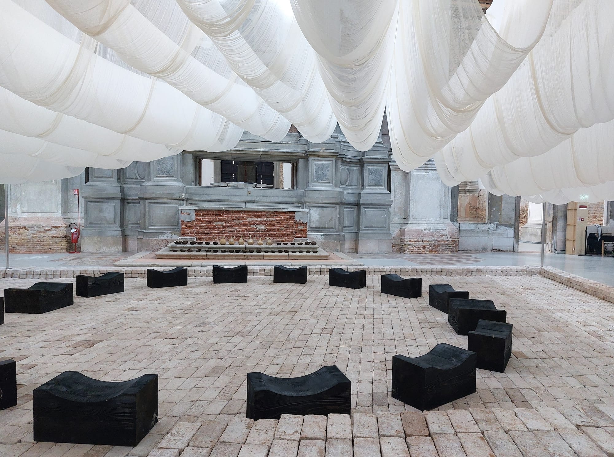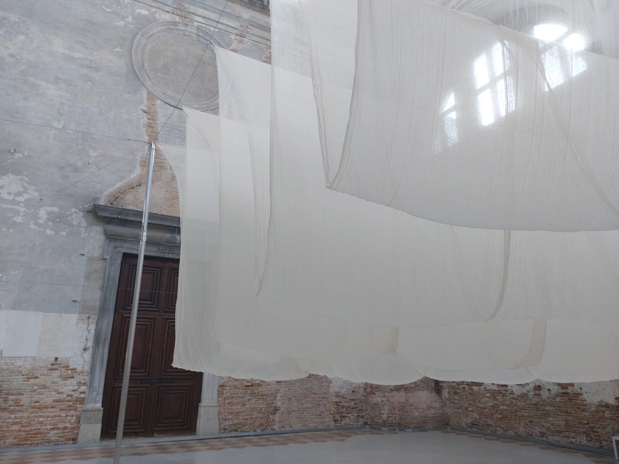 The exhibition is accompanied by a program of performances and children’s workshops. Yet most of the time Taumoepeau’s installation and Heta’s complementary piece, both meant to be activated by participants, will be left untouched and feel perhaps somewhat incomplete. Although both installations are substantial, they are dwarfed by the vastness of the Church of San Lorenzo, and thus lack immediate visual impact.