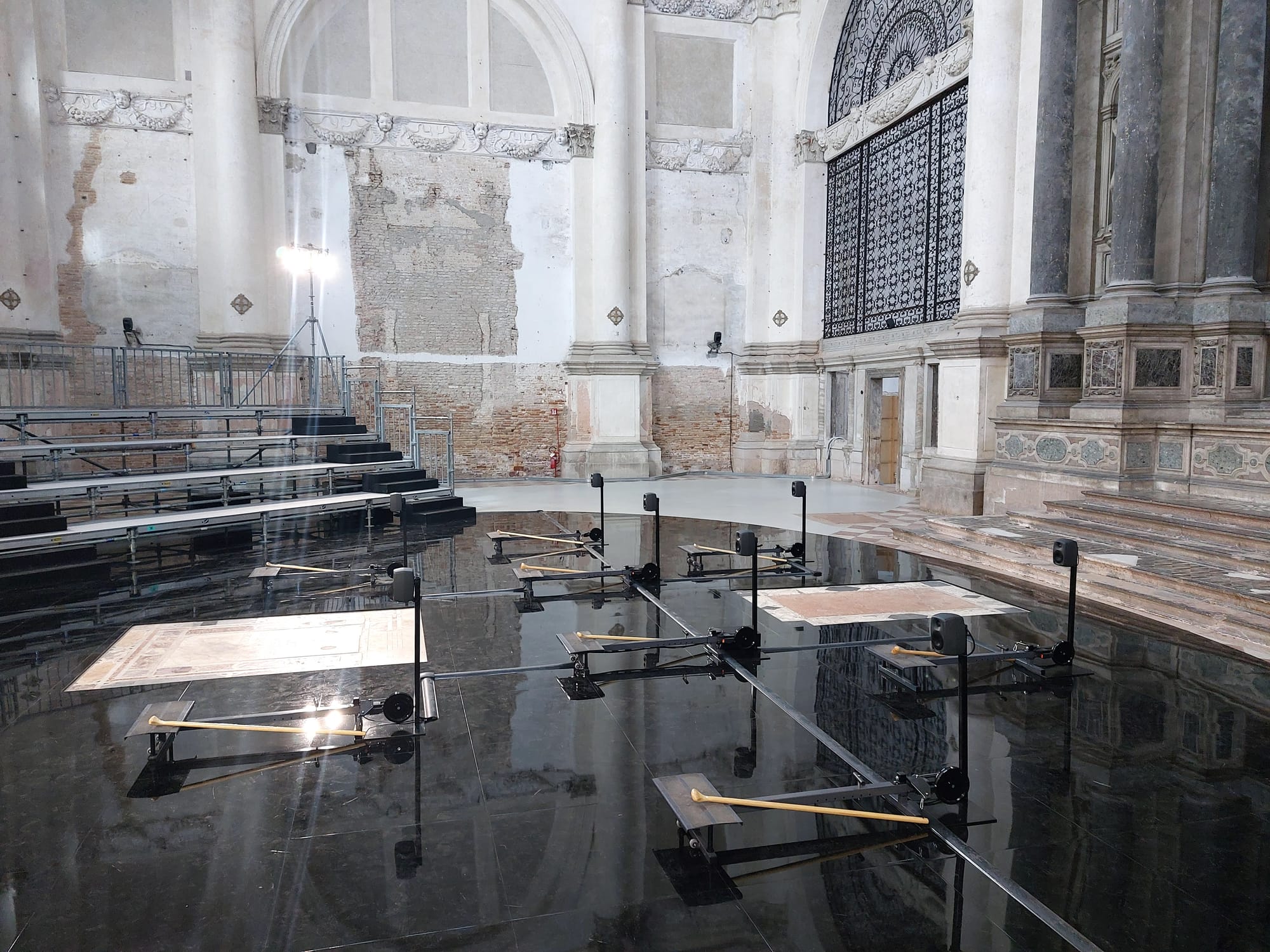 VENICE — Tongan artist Latai Taumoepeau’s installation “Deep Communion sung in minor (ArchipelaGO, THIS IS NOT A DRILL)” features a collection of rowing machines designed to practice the motions of a Venetian gondolier. Surrounded by scaffolded raked seating, the machines face the baroque altar that divides the two cavernous spaces in Venice’s Church of San Lorenzo, home to TBA21–Academy Ocean Space. While the machines are not in use, a quiet chanting can be heard, inspired by the Tongan traditional choral ritual of the Me’etu’upaki, which translates as “dance” (me’e); “standing” (tu’u); “with paddles” (paki). The chanting is amplified when visitors activate the machines; the more people join in, the louder it becomes.