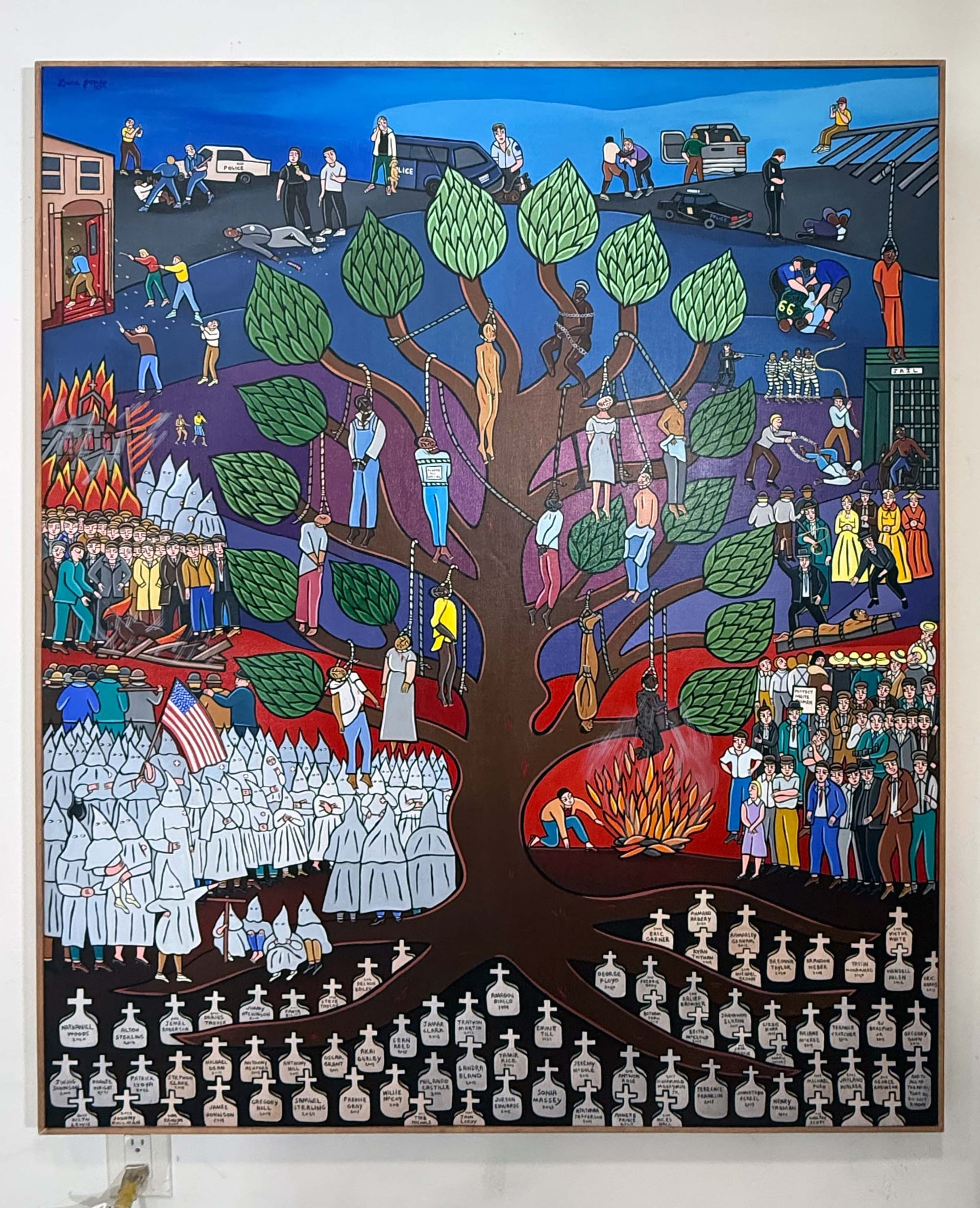 A large tree stands at the center of the painting, its branches bearing the bodies of lynched Black people. Below, a dense pack of plain-clothed White spectators gathers on the right, while Ku Klux Klan members in pointed white robes stand to the left. One figure hangs from a branch, engulfed in flames. At the bottom of the composition, rows of gravestones bear the names of murdered Black people: Sandra Bland (1987–2015), Breonna Taylor (1993–2020), and Sonya Massey (1988–2024), among many others. Some names, like Trayvon Martin (1995–2012) and Tamir Rice (2002–14), are immediately recognizable to the public because their murders galvanized the movement for Black lives, while others like Lizzie Dur (1882–95), whose death did spark protest at the time, have faded from broader public memory.