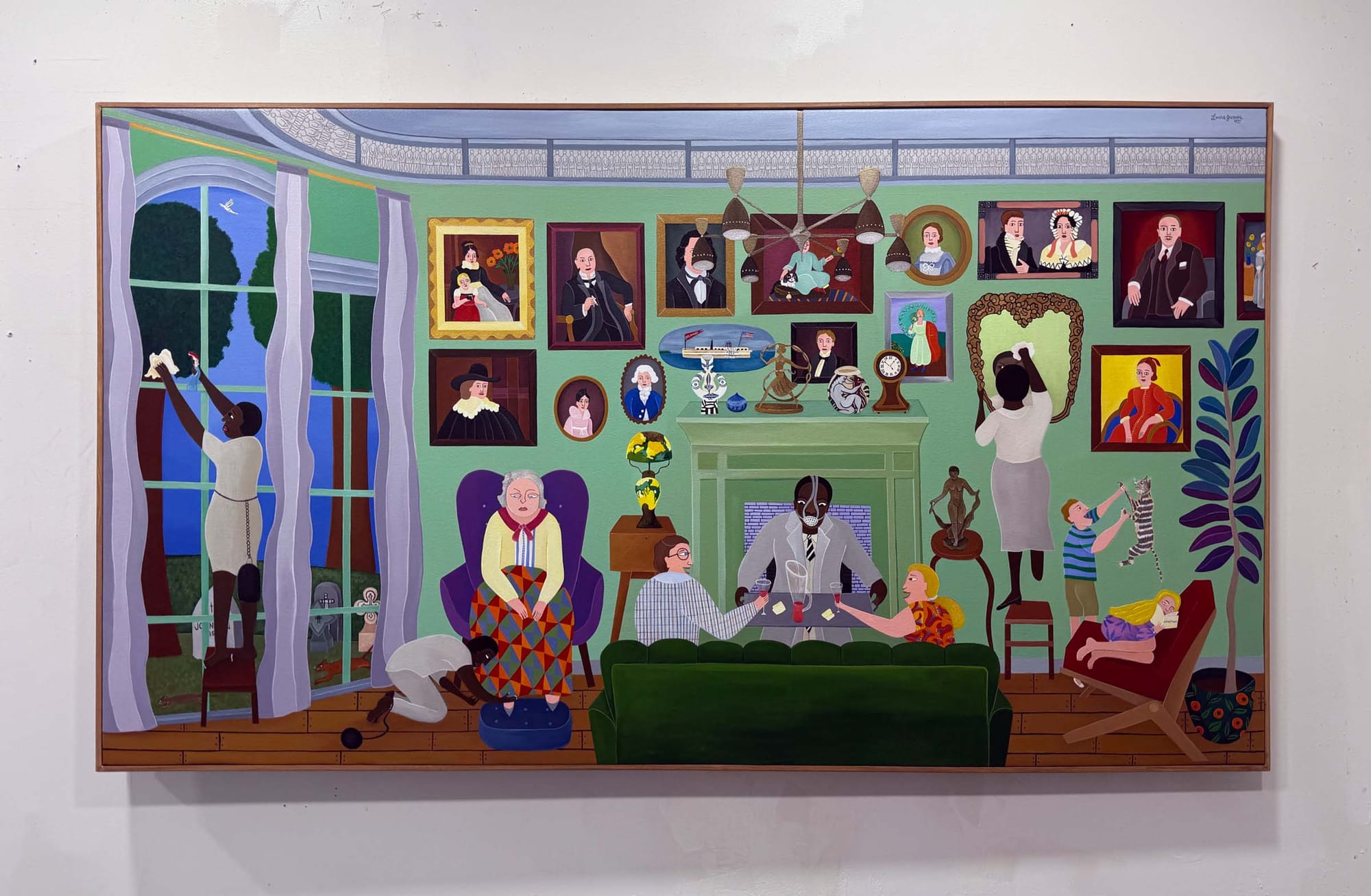 In contrast to the outdoors scenes in “Not Even Past,” James’s “Inheritance” (2024) takes place within a domestic interior. A wealthy White family’s living room with light green walls becomes the site of a fraught racial encounter in the painting: Black people are laboring within the home while the White homeowners are at leisure. This work is part of James’s larger practice of representing Black women domestic workers to honor their labor and expose Black labor’s relationship with White leisure. The scene already evokes discomfort due to the racialized history of domestic work, but closer inspection reveals other disturbing details. The woman cleaning the window and the man tending the grandmother’s feet are shackled with a ball and chain, a man serving drinks wears a muzzle, and another woman, missing a foot, balances precariously on a chair to clean a mirror. These surrealist elements are rooted in histories of enslavement and technologies of abuse on the plantation, while the symbols of torture suggest slavery and its enduring legacy. The painting suggests that the past of exploited labor is not yet fully past. At the top of the canvas, wallpaper panels depict slave ship imagery, with Black bodies tightly arranged in the ship’s hold. We all inherit this scene of racialized domesticity, and James compels us to face it.