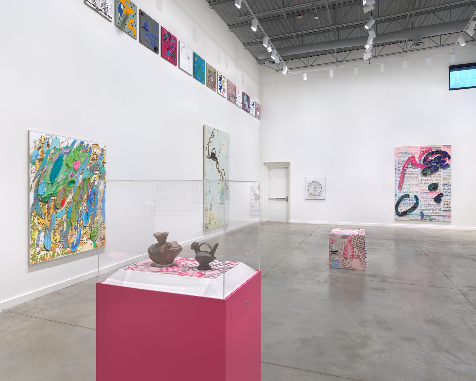 Owens did get out, and the exhibition Laura Owens: Rerun, on view at Cleveland’s Transformer Station, marks something of a homecoming. Revolving around the theme of time travel, the show spans two galleries: one features a number of Owens’s mature paintings alongside objects from a study collection at the Cleveland Museum of Art (CMA), while the other, more intimate space is completely lined with a dizzying, site-specific wallpaper peppered with all sorts of amusing Owens juvenalia and playful references to the objects in the first room. It is a show so incredibly dense with details that point elsewhere that it feels a bit like an elaborate inside joke, to which the ordinary visitor is only partly privy.