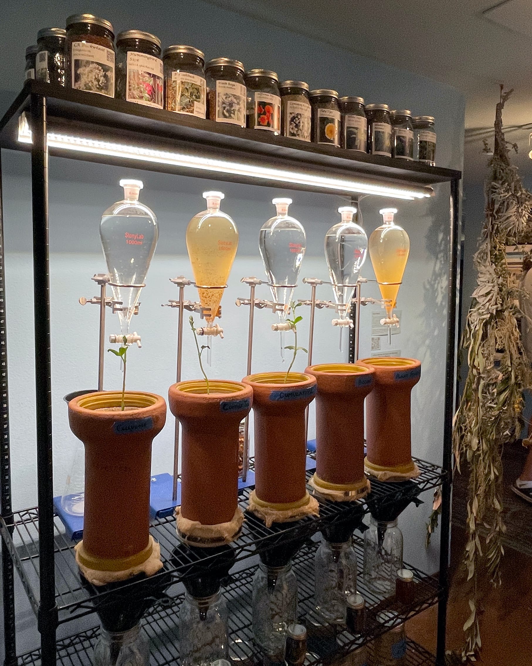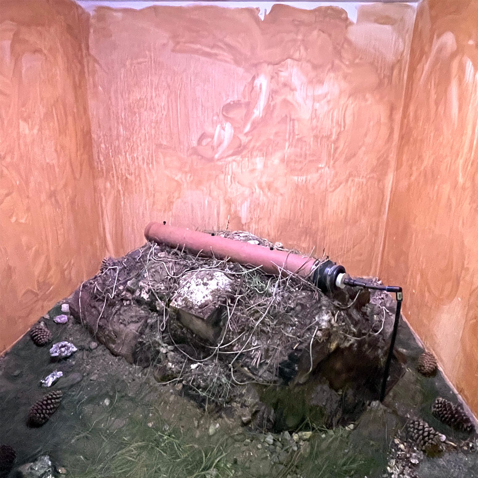 A few works near the gallery’s entrance represent Undevelopment One’s early excavation and research process. “Living Room” (all works 2022) depicts the natural and industrial materials discovered within the soil. Bon paints the walls with natural clay, and lays a long slice of terracotta pipe across a large mound of dirt, a mixture of mulch, mycelium, oak, compost, and rainwater. For “A Flow Between the Roots and Microbes; Leachate/Filtration/Bioassay,” five beakers filled with lead-based water, representing the Los Angeles River’s pollution, drip onto different species of fungi that sprout from oblong pots. The plants that thrive might be able to absorb toxins in the soil, and The Metabolic Studio will distribute them along Undevelopment One.