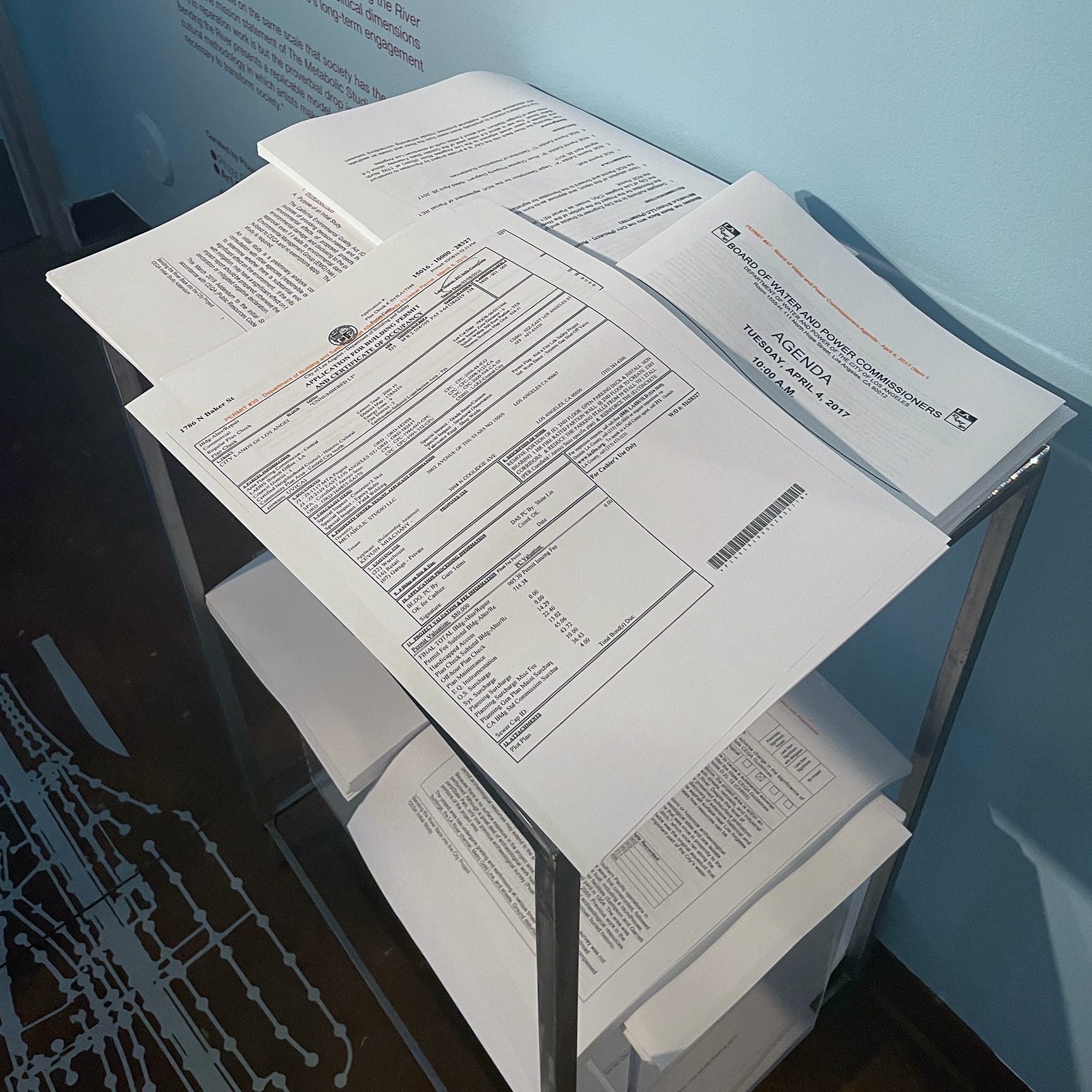 CLAREMONT, California — Upon entering Bending the River: Lauren Bon and The Metabolic Studio at Pitzer College Art Galleries, visitors have to sidestep a large stack of papers. The papers, all legal documents, are printouts of the 73 city, state, and federal permits The Metabolic Studio has had to obtain to produce the artwork in the show.