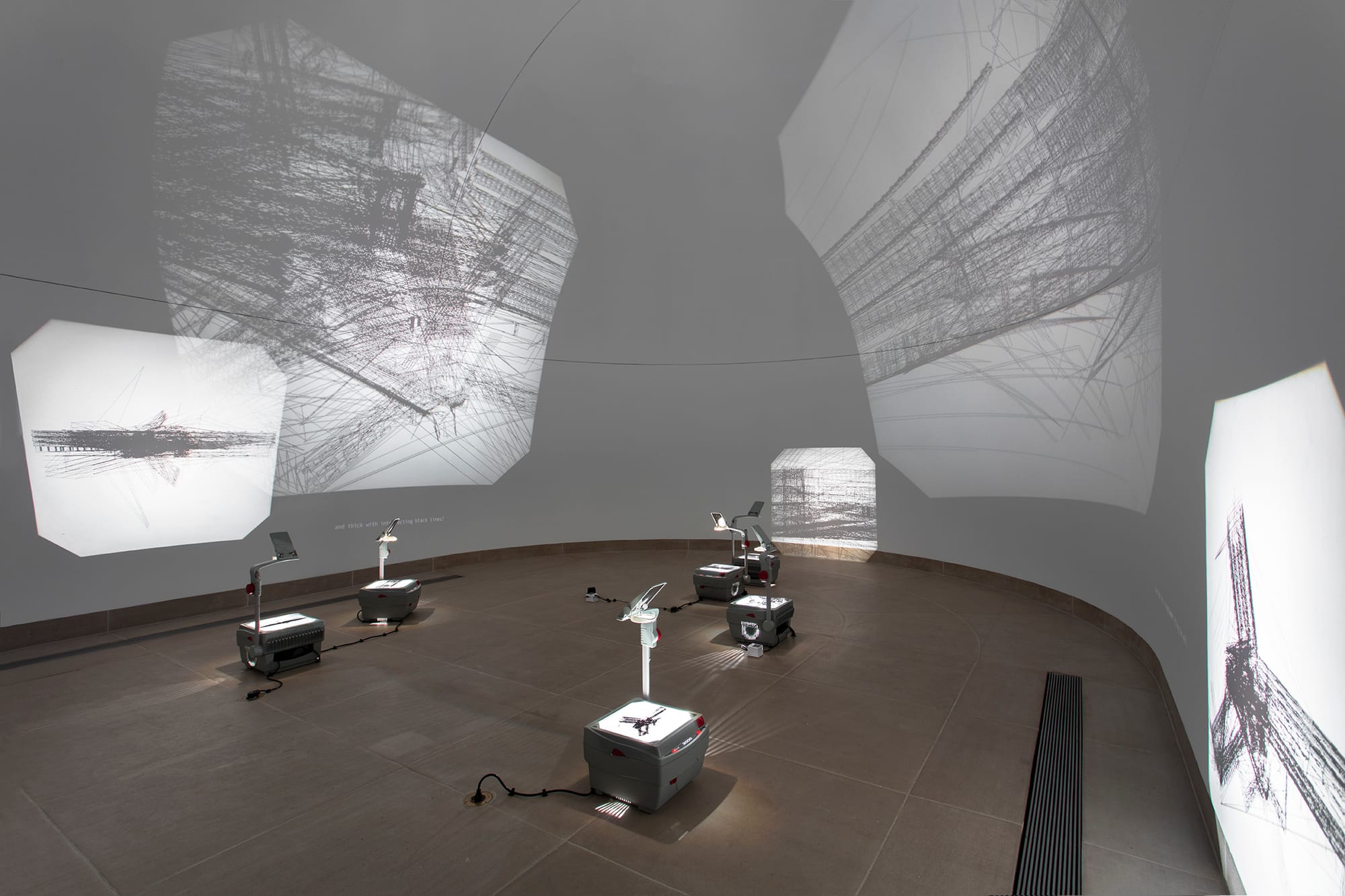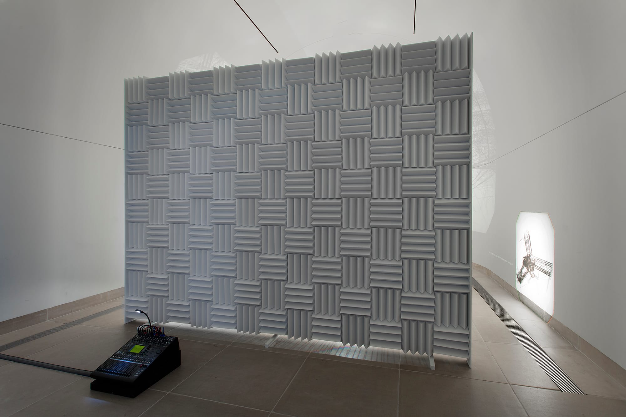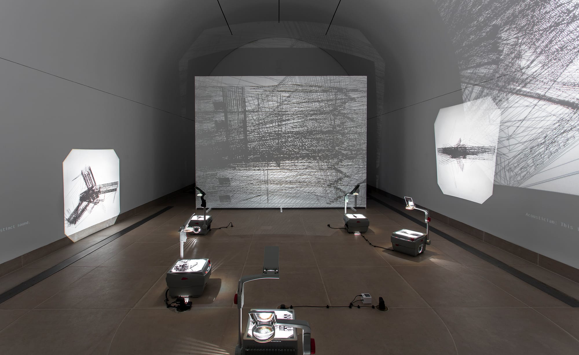 Using his expertise in sound and architecture, Abu Hamdan attempted to reconstruct the psycho-physical conditions in which prisoners lived at Saydnaya by using recorded testimonials. The exhibition, installed in a large room divided into two sections, features a recording of an Amnesty International interview with a former detainee, Salam Othman, broadcast across the space, and renderings of the prison projected onto the walls.