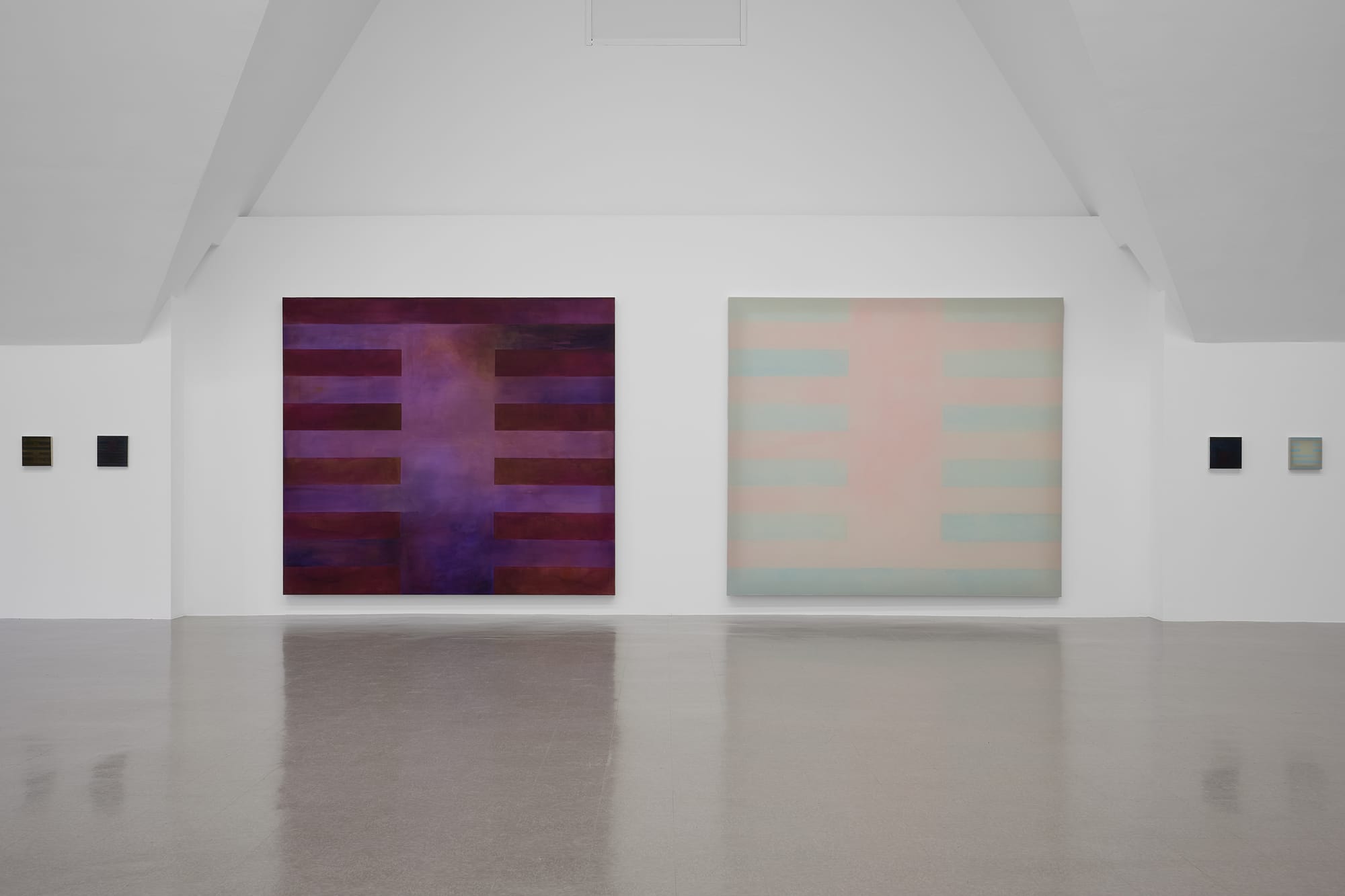 The inverse of each other, No. 63 (known as “After Completion”) and No. 64 (known as “Before Completion”) hang on either side of the gallery’s front entrance. The two largest paintings, measuring 9 x 10 feet (~2.7 x 3m), hang on the inset wall opposite the gallery entrance; they pulled me into the room before I turned to see what Zheng had done with the space. Their size seems determined by the length and height of the wall on which they are hung. Done on semi-transparent silk, one of the paintings had six luminous celadon bars broken up by a soft pink ground. The figure-ground relation shifts, and we can see the pink as a vertical bar with 5 cross bars spanning the width of the painting. One of the many pleasures to experience in the exhibition, this optical oscillation undoes the hexagram’s reliance on six bars.