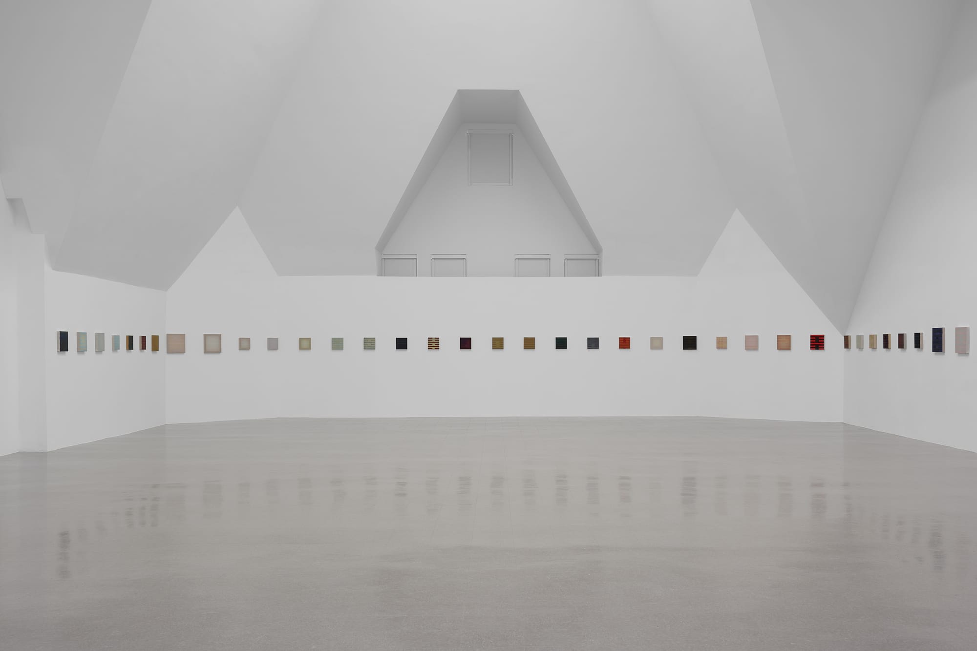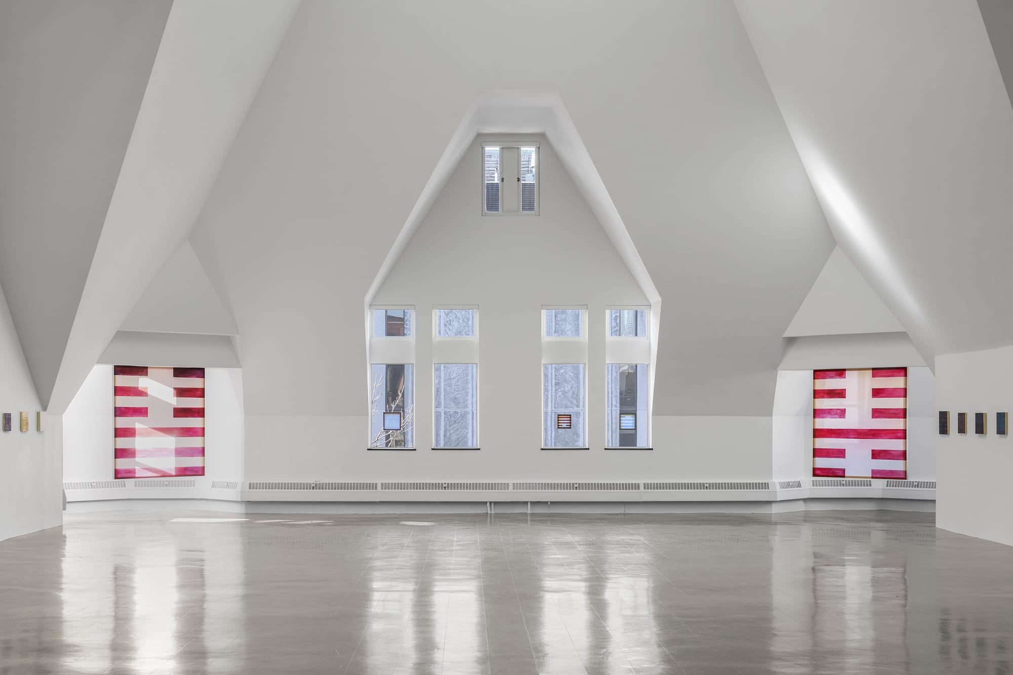 For the show, Zheng altered the architecture of the gallery, adjusting the height and width of certain walls and covering some windows, creating what the press release calls a “new rhythm” around the room to emphasize “the light of the here and now.” Zheng’s interest in the interaction of light and painting, from rough surfaces to the scrim-like supports through which light passes, expands upon Robert Ryman’s employment of natural light as a crucial component of his site-specific installations, as seen in his presentation at Dia Beacon.