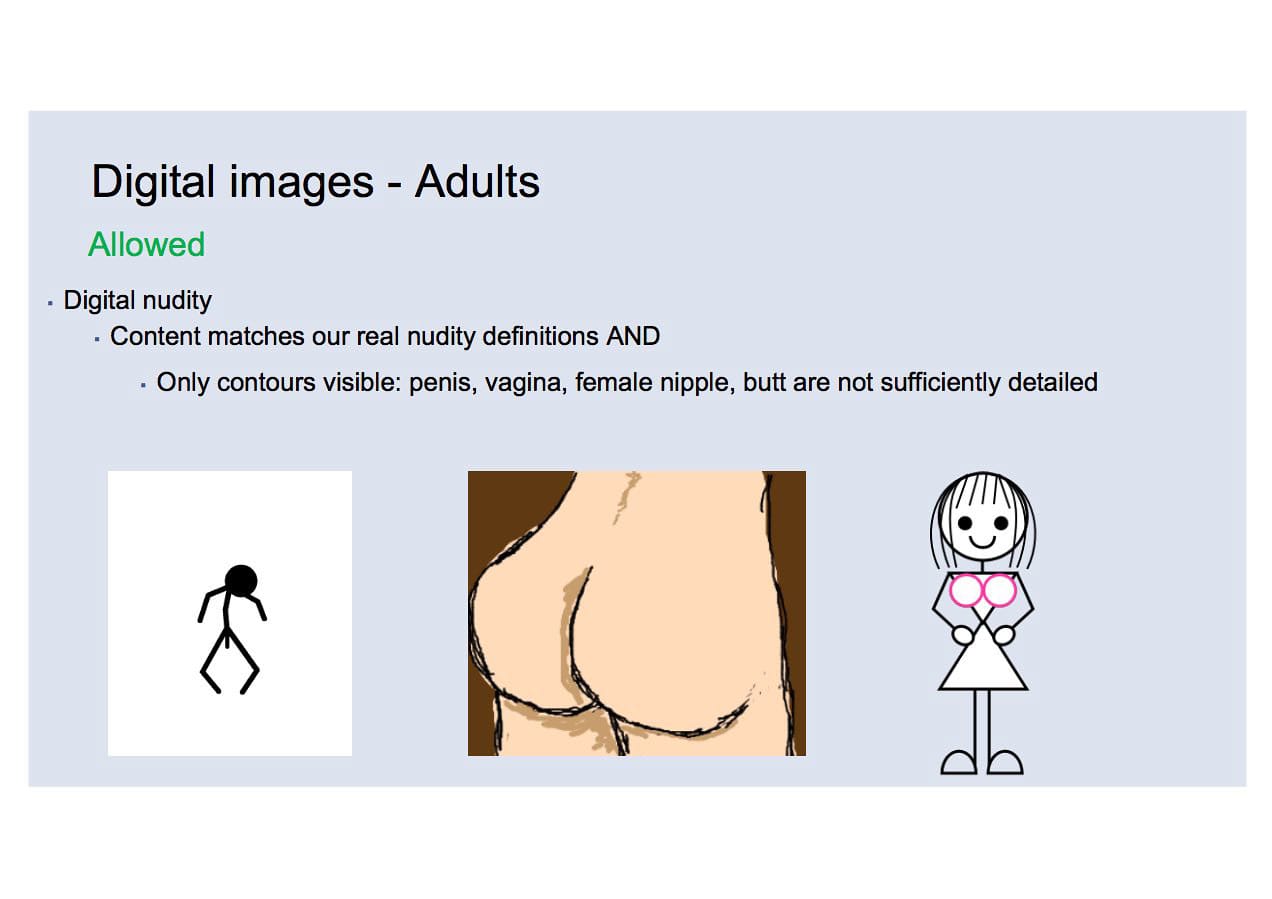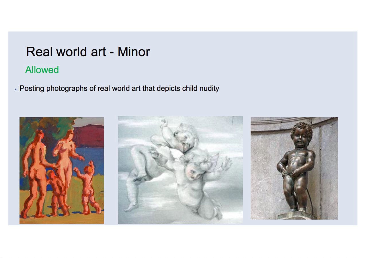 The original rule was made “so that we could remove a lot of very sexual digital nudity, but it also covers an increasing amount of non-sexual digitally made art,” a slide explains. “The current line is also difficult to enforce because it is hard to differentiate between handmade art and digitally made depictions.” The following slides go on to show examples of acceptable content, including a host of images where “paper is clearly present” and pictures that display “real world object[s],” often an ancient sculpture or relief. Child nudity is OK if it’s depicted within “real world art,” and digital nudity is allowed if “only contours [are] visible: penis, vagina, female nipple, butt are not sufficiently detailed.” (Numerous critics have pointed out the double standard of Facebook making female nipples a potential marker of inappropriate nudity, but not male nipples.)
