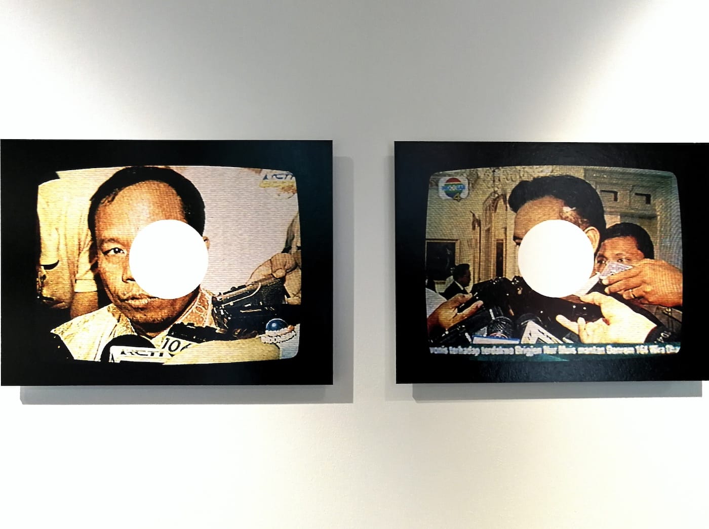 In the lobby area, one is greeted with FX Harsono’s commentary on media and its discourse. Made in 1998, the work lines up 20 television stills, where a white circle obscures each politician or correspondent’s face. By emphatically stripping the speakers of agency over their words, the work points to the political elites’ empty rhetoric, and their failure to foster effective dialogue with ordinary people. The work sets the tone for the show, wherein the artist, attentive to the hierarchies and injustices of society, disrupts the normative flow of power in the mainstream realm.