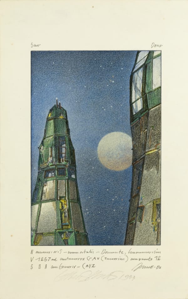 Like an elaborate steam punk storyboard the artist mixes classical allusion, technology and humanity with equal measure. His “4 Cities and Beyond, Region R” (1983) renders two towers in soft colored pencil against a dark blue night sky with the delicate fancy of an illustrator. For an “architect” his use of color can be breathtaking. Woods’ towers appear fleshy. There also we find a number of drawings filled with the dramatic coloring, monumental machinery and otherworldly natural scenes of the science fiction comic book. Scanning the gallery wall the eye flits between each series, bridging the space of some 1,000 years of human invention.