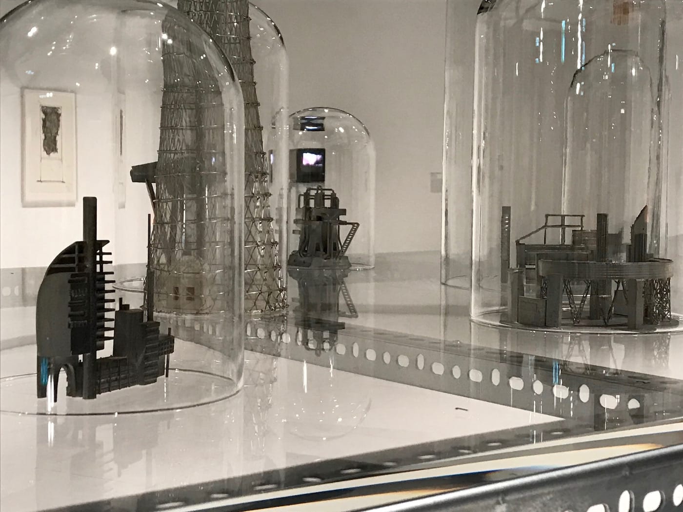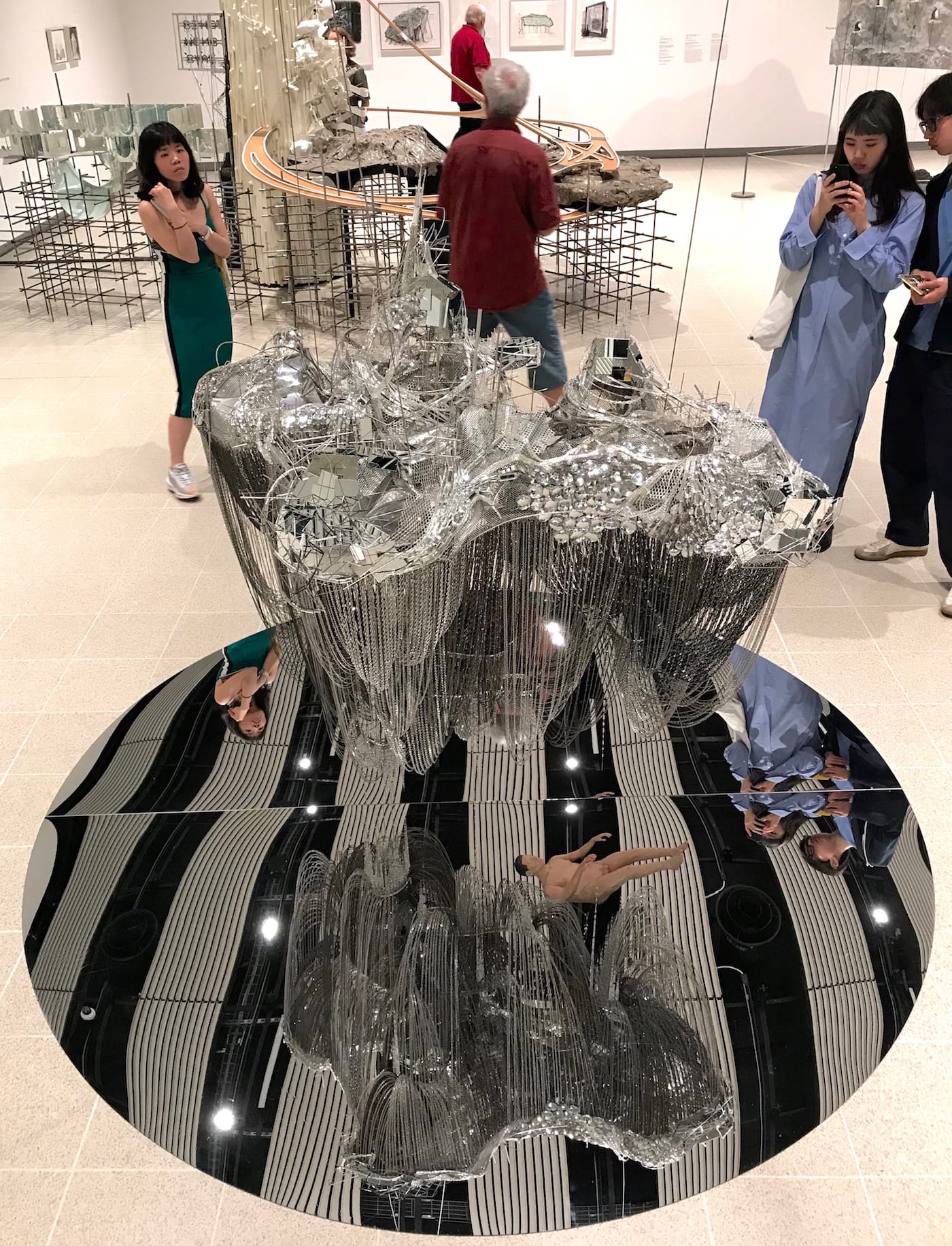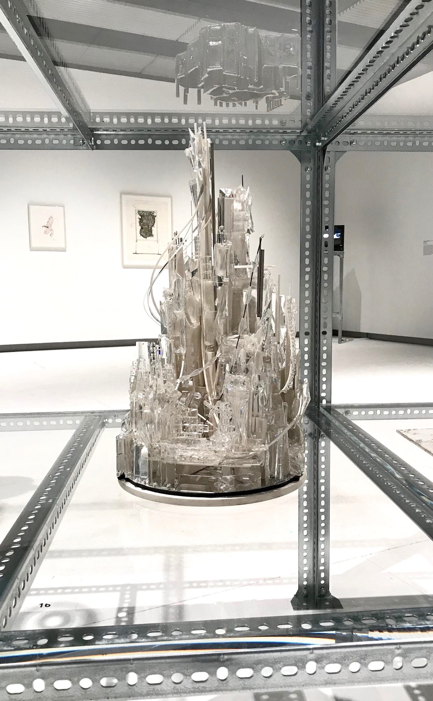 Elsewhere, there is a clearer relationship between the economic and political histories of South Korea and Lee’s work. Born in 1964, the artist grew up under the dictatorial regime of President Park only to later witness the military junta and rise of the authoritarian President Chun Doo-wan, whose army forces killed over 600 people opposing his leadership in the bloody Gwangju Uprising of May 1980. The curators have done well to include two chronological charts within the galleries that outline Lee’s place in the political and feminist movements at the time, while marking the broader history of the regime, and South Korea’s division from North Korea. Lee takes this fractious, often violent history and sculpts steel and crystalline structures that are simultaneously complex, magnificent, beautiful, fragile, and just as dangerous as the world she inhabits. Viewers get a taste of this work in the second gallery, which contains a series of small maquettes (c. 2005) that reference the legacy of Russian Constructivism, the early 19th-century doctrine that called for geometric and material purity within aesthetics. Preciously preserved in bell jars, Lee’s small buildings illustrate the alluring fantasy of design space. The “dream home” (or even “dream skyscraper”) speaks to the need for livable architecture in a city experiencing a construction boom.