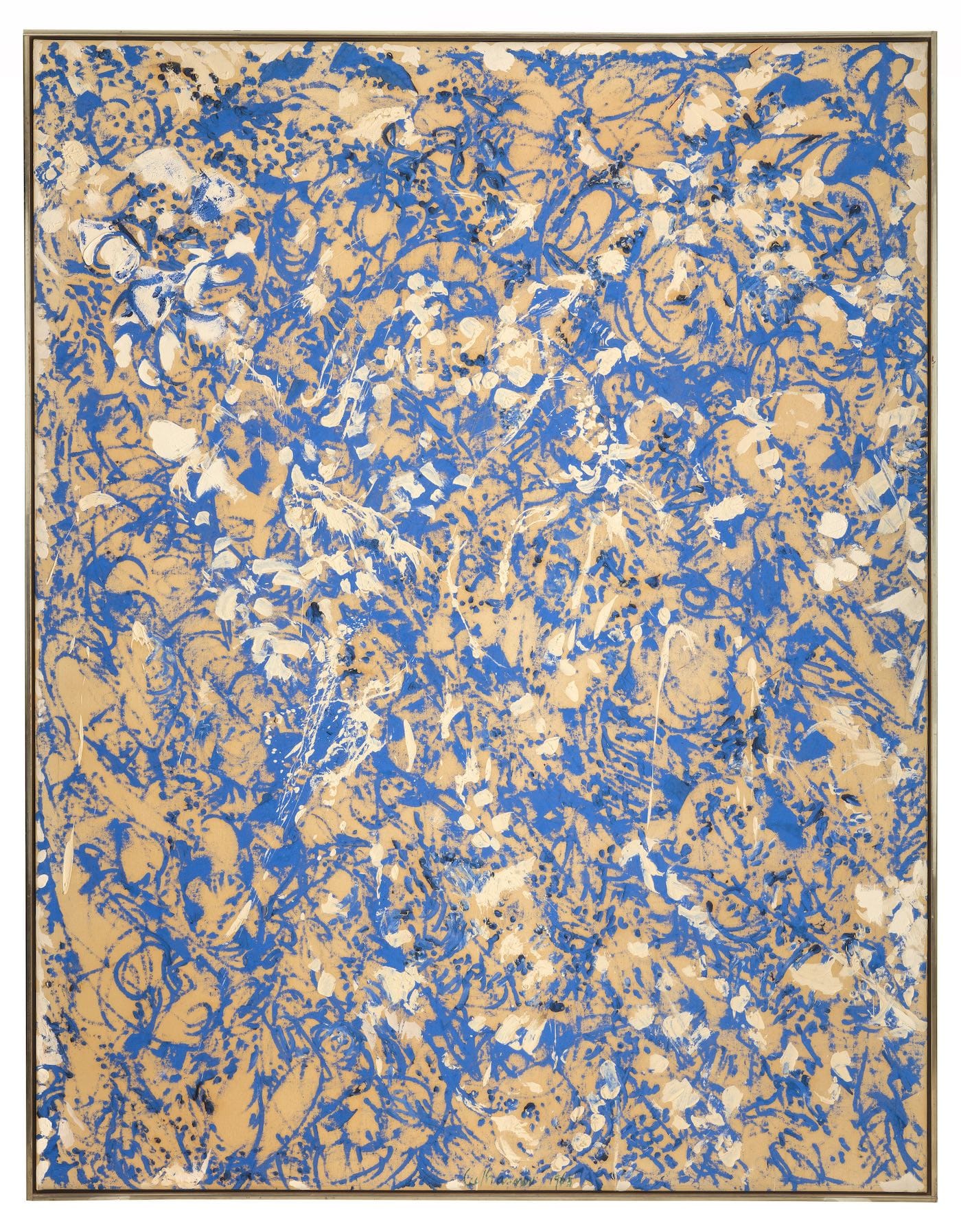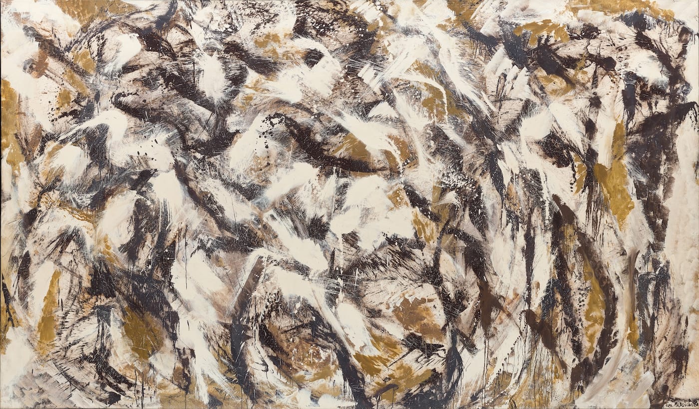 Built on dense paint strokes integrating cream, white, and umber, the panoramic “Polar Stampede” (1960) resembles interlaced tree branches limned with snow, while warm, textured spindles of splattered paint conjure the pelage and underfur of exotic animals. Given the primal and enigmatic energy at work, these paintings also seem to channel the atavistic mystery of prehistoric cave paintings.