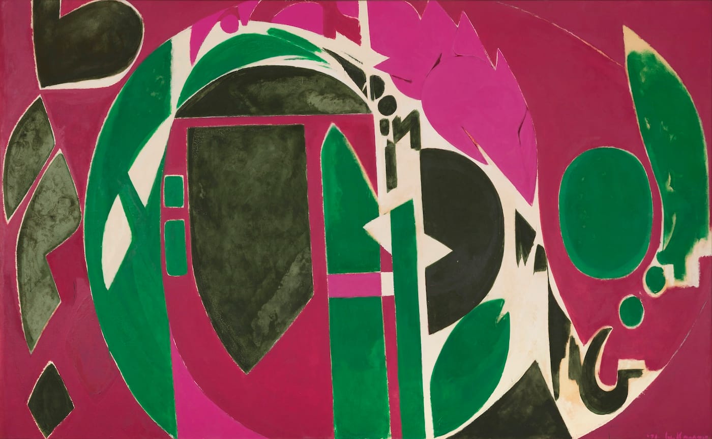 The epic, feverish, red-pink“Palingenesis” (1970) displays Krasner’s ongoing embrace of large-scale painting while paying subtle homage to Henri Matisse’s late work. With leaf-like green and pink cutouts integrated among nonobjective forms, the painting is her most confident investigation into the interrelationship between the abstract forms in art and nature, in which nature reproduces itself through aesthetic displays, from flower blossoms to peacock struts, that resemble the artifice of painting.