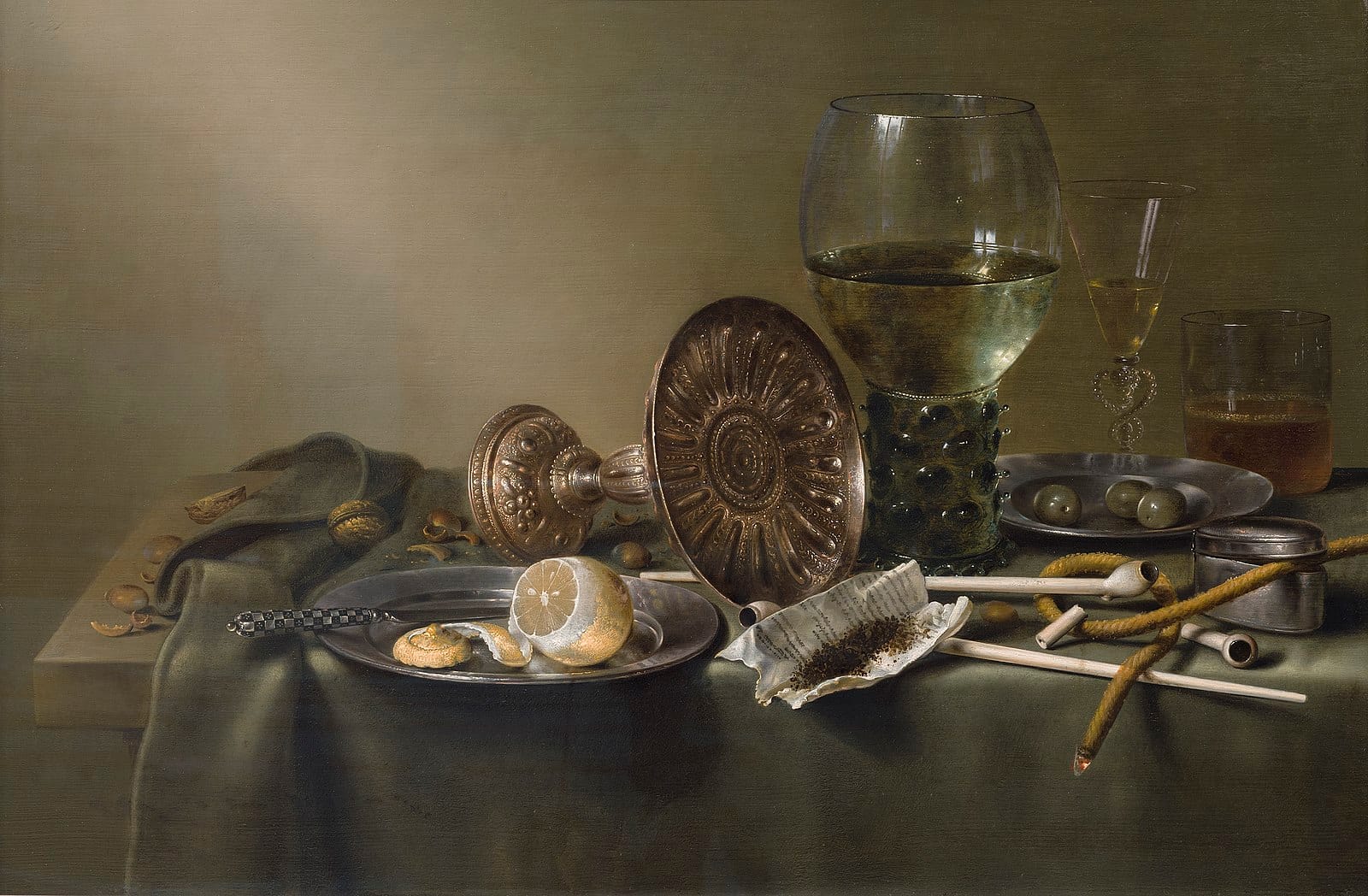 A particular master of the genre was Willem Claesz Heda, who repeatedly returned to the subject of mussed tablecloths and overturned glasses, variously pictured with abandoned oysters or the accoutrement of tobacco consumption.