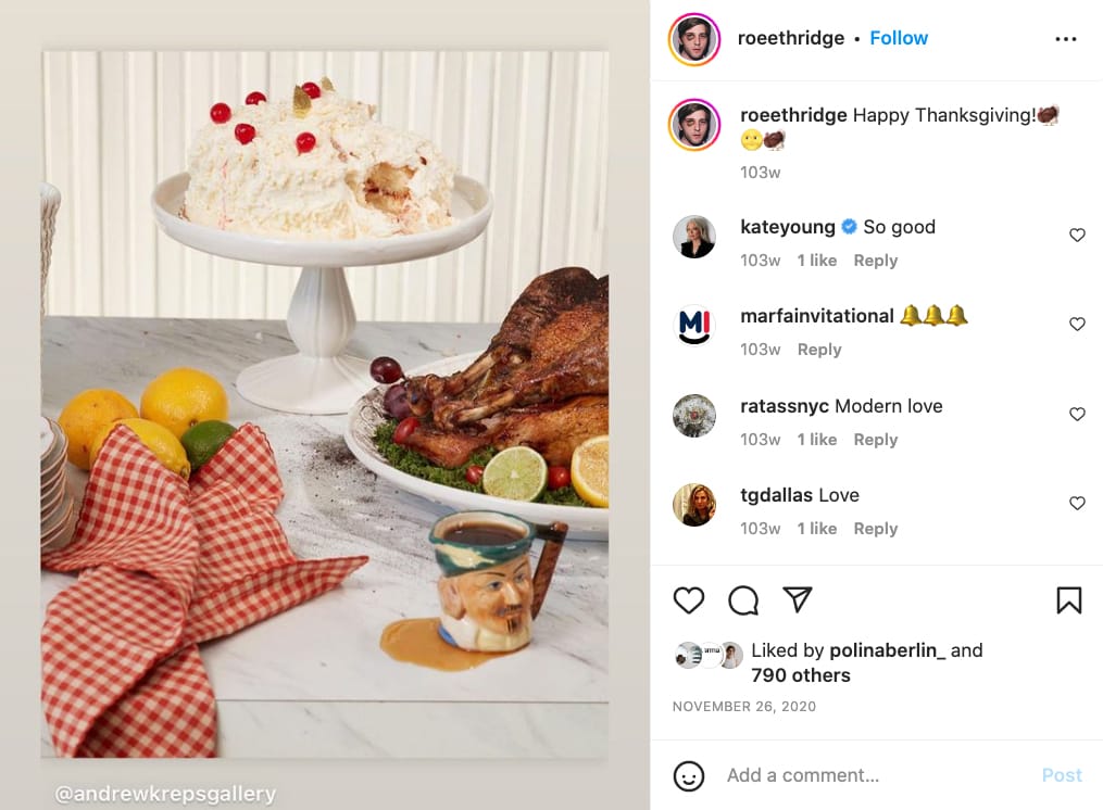 Photographer Roe Ethridge also sometimes takes on the dark side of meals, with his trademark style that implements commercial photography effects while presenting askew imagery that subtly undermines the generally glossy presentation. "Chanel Necklace for Gentlewoman" (2014) is a conscious and evocative send-up of the Dutch veritas tradition, with a majestically splayed brie and brand logo added for extra effect. And for all its uncomfortably perfect polish, a perhaps distinctly American undercurrent of shame defines his Thanksgiving 1984 series: “In 1984 my aunt, uncle, and cousins came to Atlanta for Thanksgiving," Ethridge explained in an interview. "I was fifteen, and they brought my twenty-year-old cousin, whom I suddenly developed a crush on. That’s the picture that I need to recreate, I thought, that forbidden desire. It was embarrassing.”