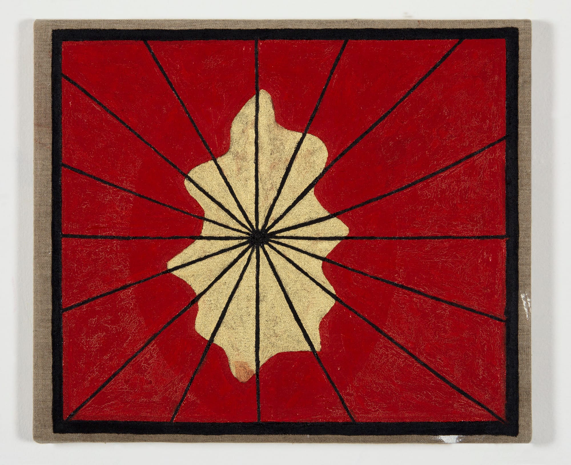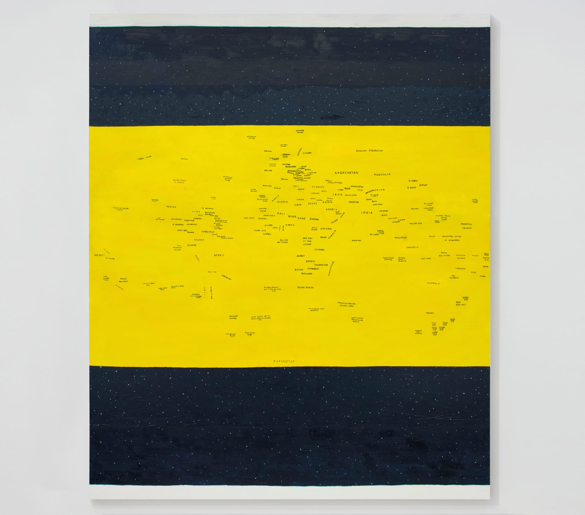 He continues working with maps, posters, and the like in “Billions of Never Ending Universes” (2015). A map of the world is composed of names of nations on a bright, patchy goldenrod ground between two blue horizontal borders that represent the night sky, flecked with stars. “Billions” has the charm of an old homework assignment; its uneven paint application and hand-lettering project a sense of ingenuousness while the subject matter evokes the childhood realization of how endless and diverse the universe is.