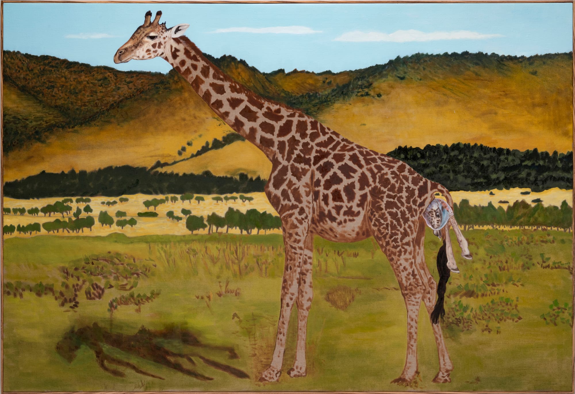 In “Giraffe Birth” (2017), spittle drips from a newborn’s snout, barely poking through a red, glistening amniotic sac. Legs buckled out in front of its face, the newborn is wide-eyed and looks ready to run. By contrast, the mother giraffe stands unfazed amid the dry savanna. Her shadow is painted as a limp reflection smeared in the dirt, an odd detail characteristic of Churchman’s occasionally loose style — used to great effect when rendering light in water, streaky clouds, or even the wear on a photocopied sign.