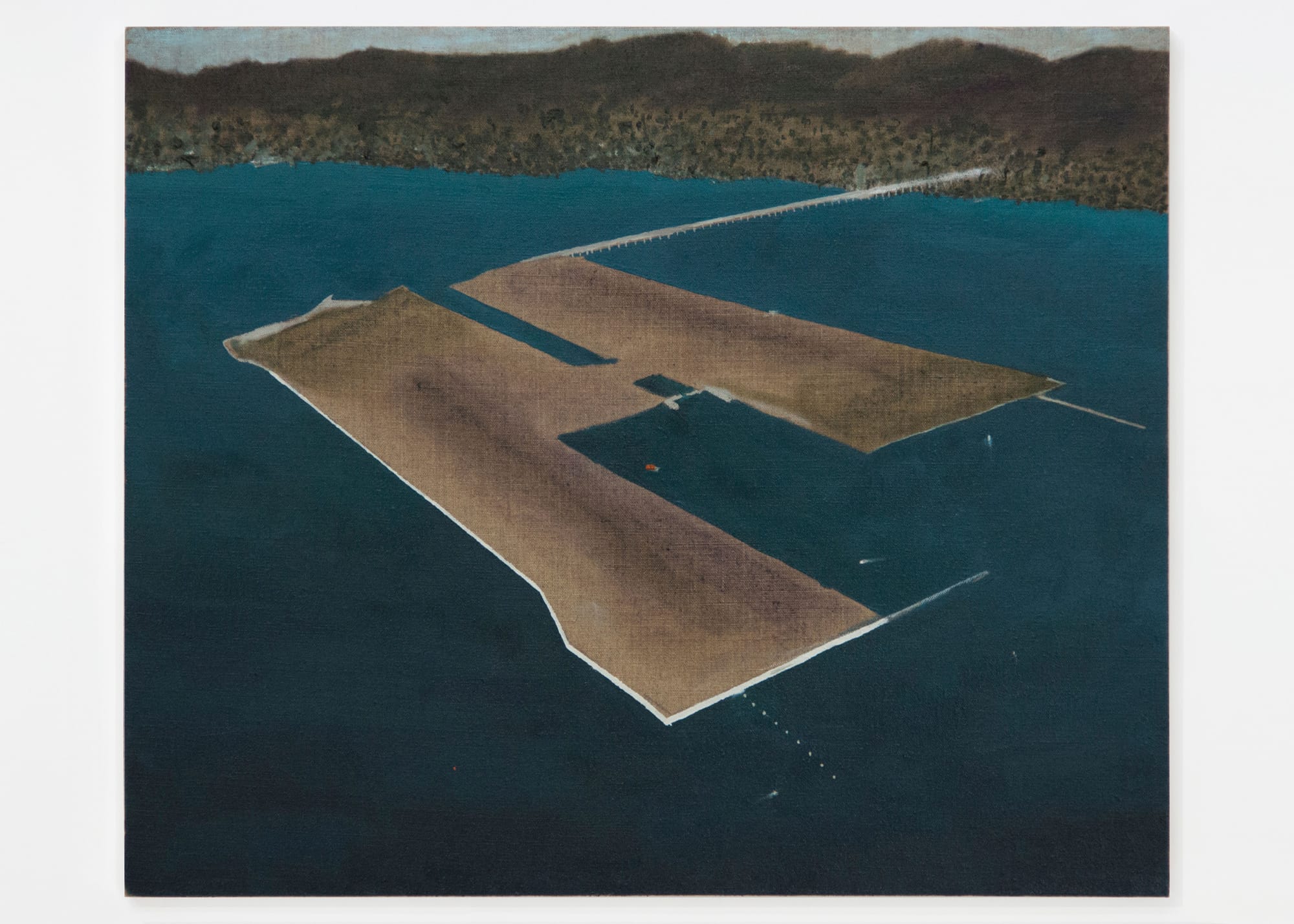 At the center of Crocodile is a gallery containing over 20 variously sized paintings, all created between 2014 and 2018 and hung cheek by jowl in a line around the room. The subjects rarely correspond to one another, emphasizing Churchman’s style of painting as a way to take in his surroundings. His technique ranges from unrefined but sincere, as in the lopsided gold amoeba surrounded by cracked red paint in “Golden Vagina Mouth of Time” (2016), to decidedly meticulous, as in the darting boats and bridge piers in “Japanese Airport” (2015). Walking among these works is like trying to follow all the turns in a Marianne Moore poem. Just as Churchman’s “Basically Good” (2013) pictures a field rat staring at its reflection in a puddle, Moore’s “An Octopus” (1935) begins with a description of the “deceptively reserved” animal. Both re-imagine animals in nature as unexpectedly relatable without anthropomorphizing them.