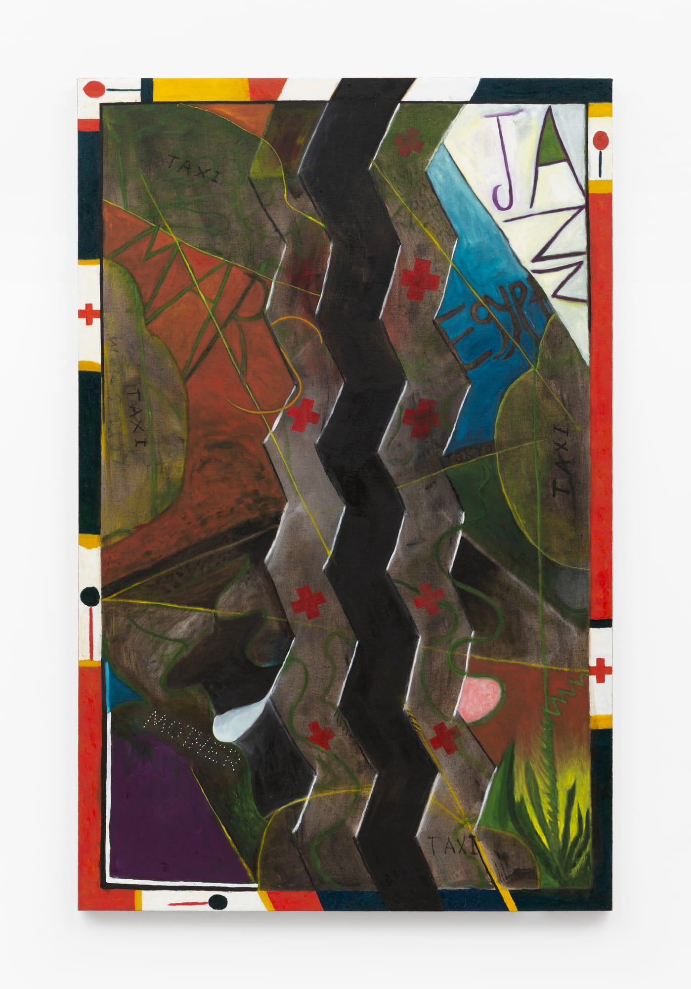 The key to Churchman’s visual and symbolic world might lie in “Mother” (2018), a jigsaw puzzle of influences that crowd the canvas like a foreboding dream. A backlit weed grows in the corner, and the words “Taxi,” “Egypt,” “Jazz,” and “Mother” — the last ominously rendered in dotted letters as if they were poked out — appear like stressful thoughts streaming into the brain. A black zigzag vertically bisects the canvas at the center, its edges trimmed with white, making it appear 3D as the void of the zigzag is pushed further into our space. “Mother” looks like one of Stuart Davis’s Jazz Age parties gone darkly haywire.