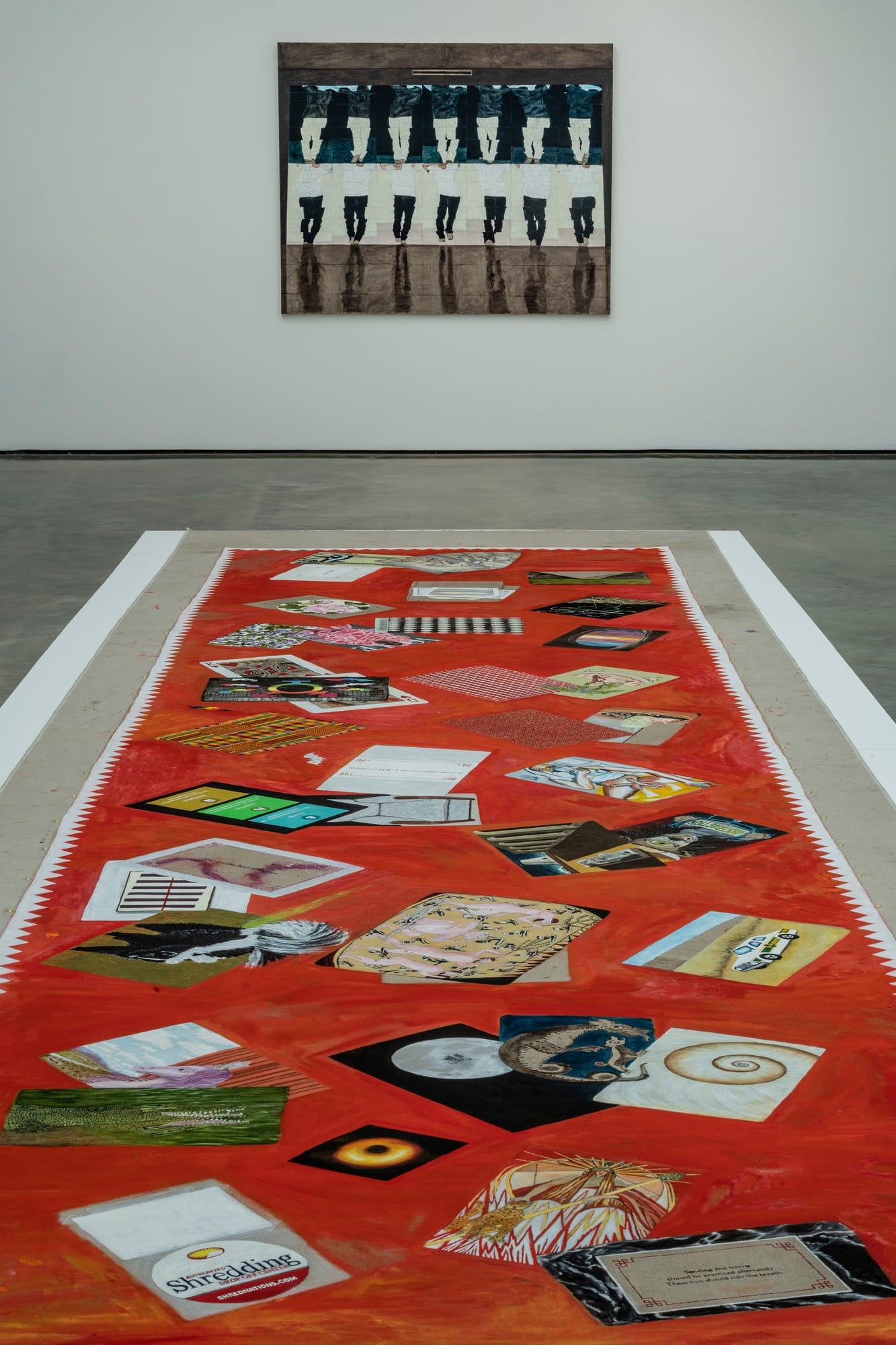 Churchman’s paintings are captivating for how they make the absolutely mundane seem awesome, and this informs his immense floor painting, “Don’t Try To Be the Fastest (Runaway Bardo)” (2019), commissioned by the Hessel and made with the help of Siobhan Liddell. The painting is composed like a long carpet, scattered with sketches and images sourced from a Vogue cover, E.T. biking across the moon, Chinese painting, the animal kingdom, Churchman’s own previous paintings, and bolts of billowing, patterned fabric. It also includes Tibetan Buddhist Lojong cards that read “In postmeditation, be a child of illusion” and “Sending and taking should be practiced alternately. These two should ride the breath.” These sentiments seem to sum up Churchman’s open, sincere practice of reflecting the world.