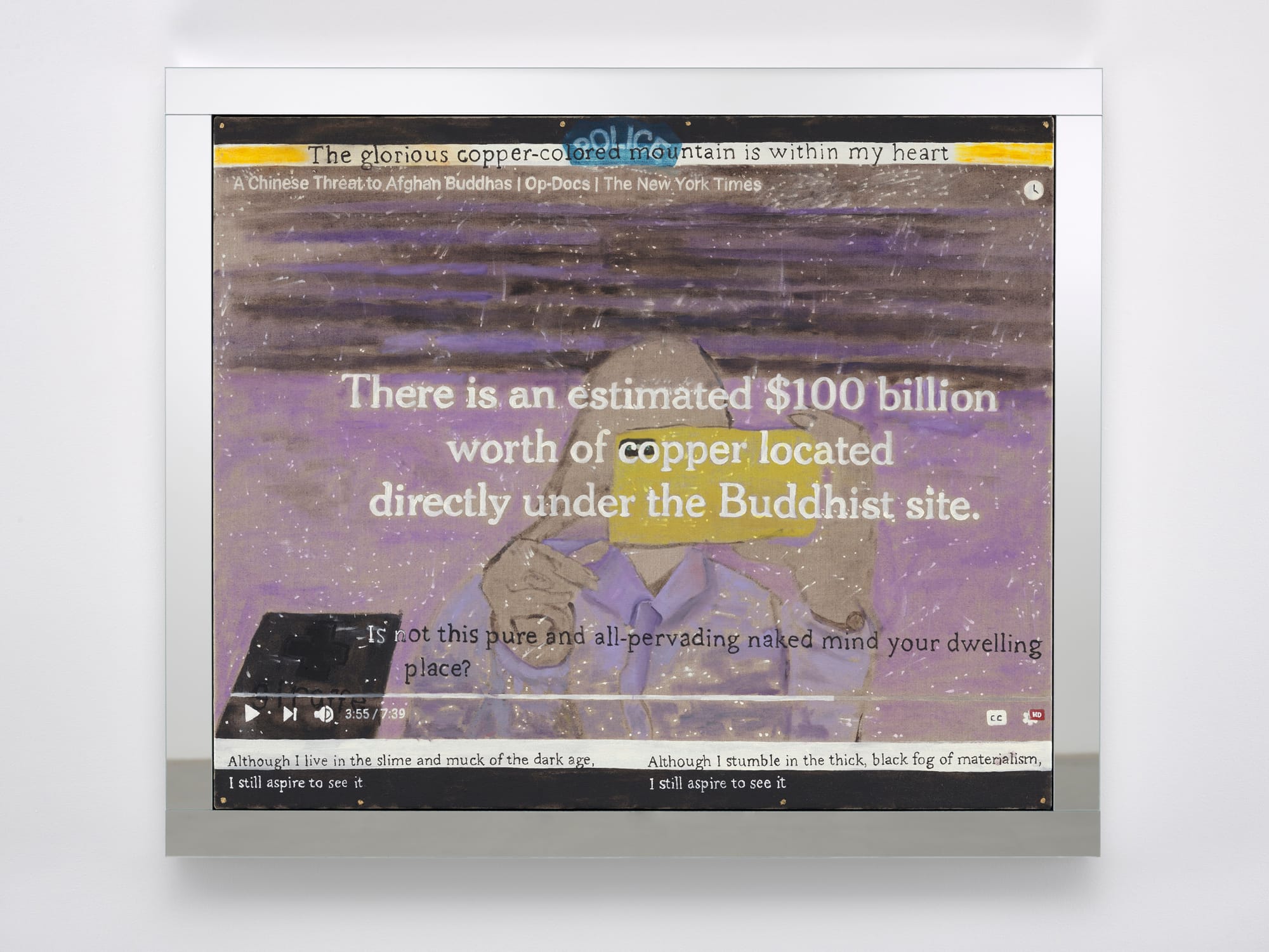 Near “Reclining Buddha” and “Kishkindha Forest (Jodhpur),” “100 Billion Sadhana of Mahamudra” (2020) layers images and text into a galaxy of information, meaning, and perspectives. At the center of a stormy violet cosmos — or cyberspace (indicated by a video control bar and a New York Times headline) — a faceless figure snaps a photo with an iPhone. Two partially obscured words, “Giraffe” in the lower left corner and “Police” at the center top, refer to different paintings by Churchman, while two aphorisms by Buddhist teacher and meditation master Chögyam Trungpa Rinpoche run along the bottom: “Although I live in the slime and muck of the dark age, I still aspire to see it”; “Although I stumble in the thick, black fog of materialism, I still aspire to see it.”