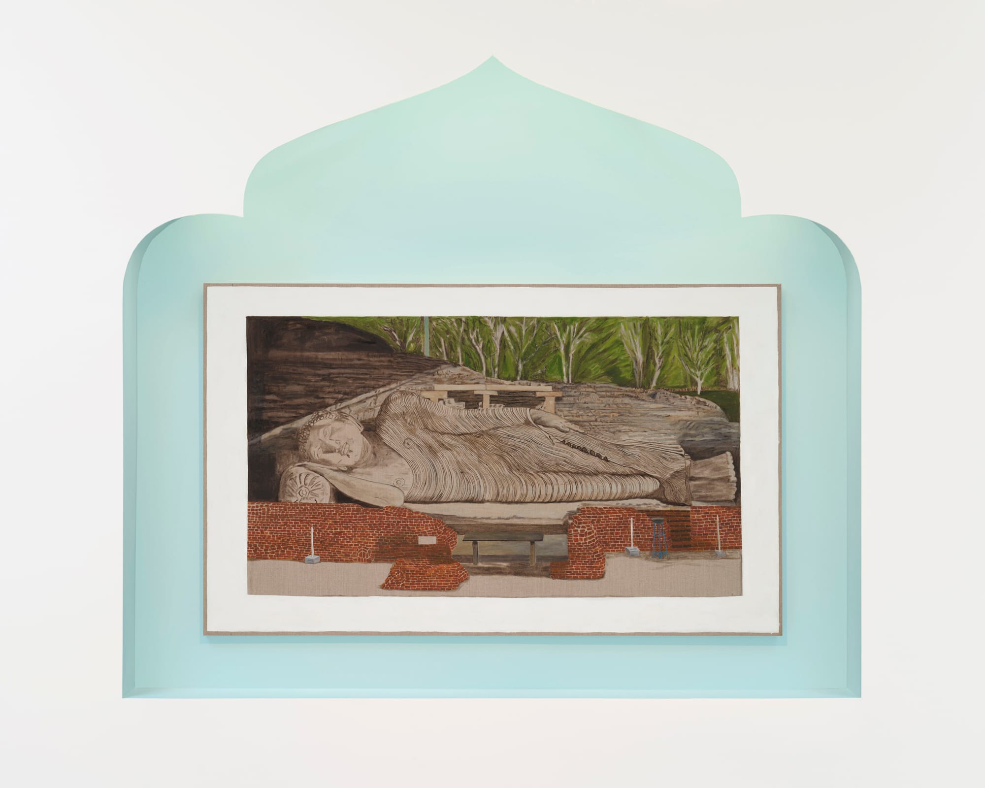 While the niche, painted pale turquoise, sets the monumental Buddha apart from the rest of the show, a bench in the center of the room, mirroring one depicted in the painting, invites pause and contemplation.