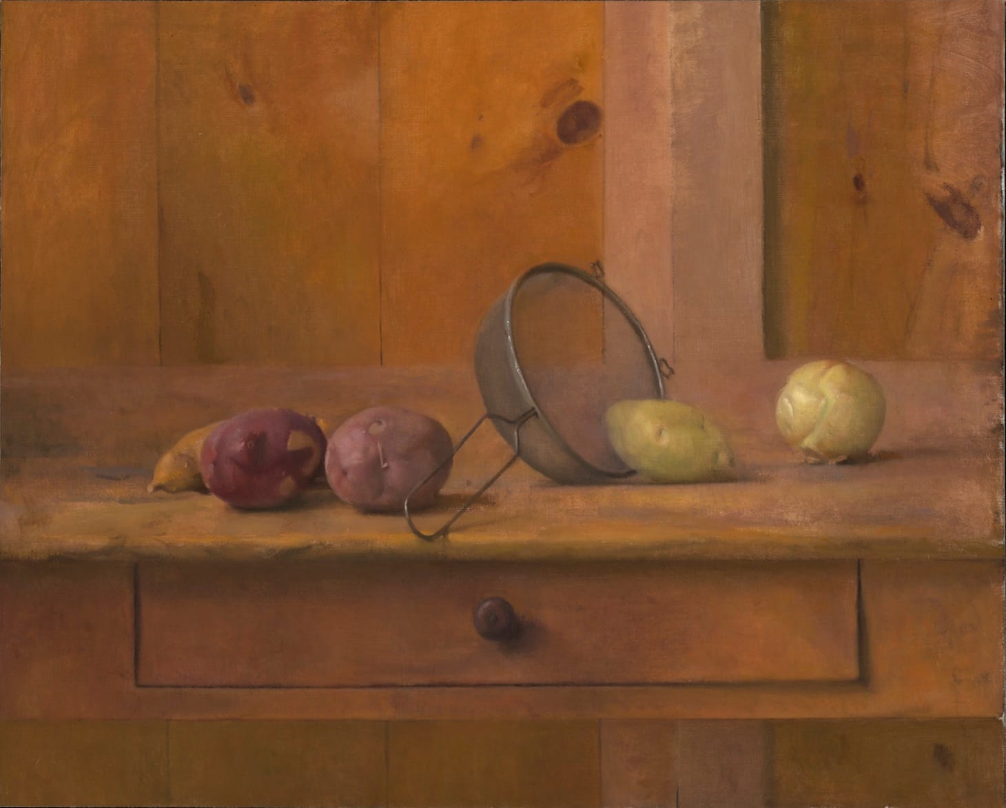 One of Anderson’s great works, “Still Life with Red Potatoes, Yams, Onion and Strainer” (1990), is in the exhibition. This is a nuanced tonal painting that seems to have been generated by the things in it and the environment: red potatoes, yams, and an onion on a wooden table against a wide-plank wood wall. What makes this painting special is the strainer, which is set at a diagonal, with the red potatoes and one yam on the left and a yam and onion on the right. The strainer helps us see the painting, as it demarcates where the table, on which it sits, ends and the wall begins. Its porous mesh is a tour-de-force of painting in service of the painting, intended to pull the viewer into a believable space. With nothing working in counterpoint, the potatoes would become boulders sitting on an earthy brown plain.