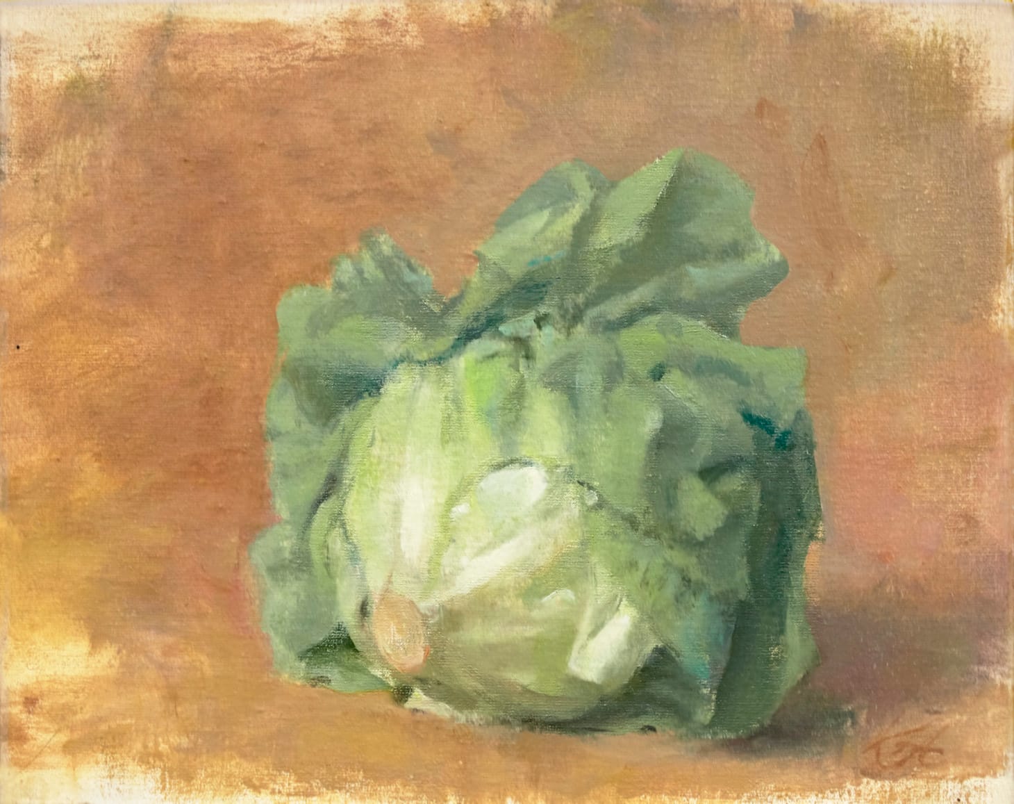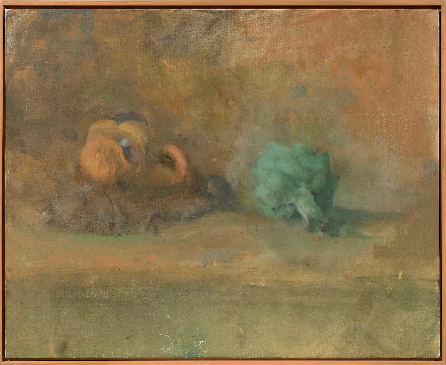 More than a decade earlier, in “Still Life with Kettle” (1977), Anderson juxtaposed a table with dark green legs against a green wall with red and yellow trim. The tabletop is unpainted and floats within the green space, rendered as a narrow, tilting plane on which we see an empty cruet and salt shaker in front of a shiny metal teapot with faceted sides. The transparent cruet calls further attention to the teapot’s metallic surface. While I don’t want to overdramatize Anderson’s diminishing viewpoint, I cannot help but think about it when I look at “Lettuce #3” (1995), which focuses on a single head of green lettuce against a thinly painted, brushy mustard brown ground.