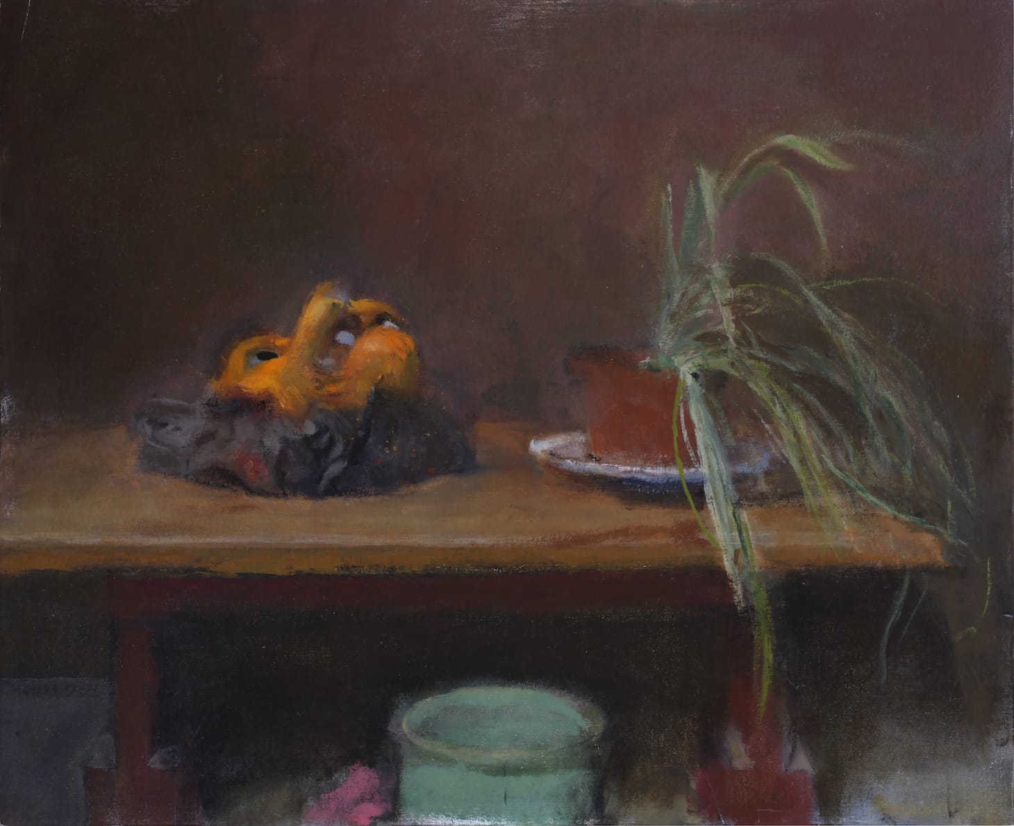 As with “Lettuce #3,” Anderson has moved in close, but in “Lion Mask” the autumnal light is dissolving the mask. In “Lion Head and Artichoke,” the mask and vegetable are resting on a table, which is hinted at by the paint but never crystallizes into an image, never becomes palpable. Across the bottom edge, a thinly applied band of olive green holds up what I take to be the table. The orange and brown mask lies face up next to the green artichoke, which functions like an arrow, pointing the viewer toward the painting’s coppery ground, which can be read as a wall or as atmospheric space, or — as can only happen in a painting — both. Form and dissipation meet along the edges of one another.