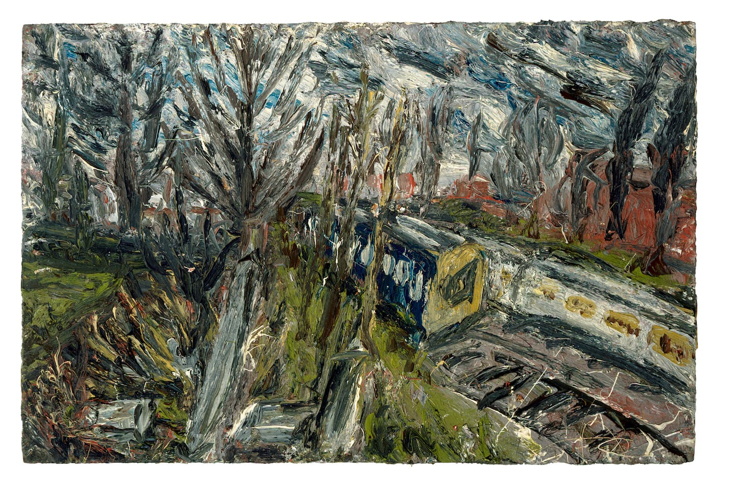 Not so when he looks beyond the window, and begins to spar with the built structures of London, the city where he lived all his life. The urbanness of the urban, its rush, its roar, its jangliness, was his other great preoccupation. Here his paintings take on speed, movement, rhythm. A railway line was at the bottom of Kossoff's garden. I could hear the momentary whoosh of a train at that first interview. His paintings show lit locomotives: hectic, wormy, rushing headlong through some deep gulley just beyond the trees that partly conceal their presence. He would go down to King's Cross Station, annotate in drawings what he had seen, then work on a painting back in the studio.