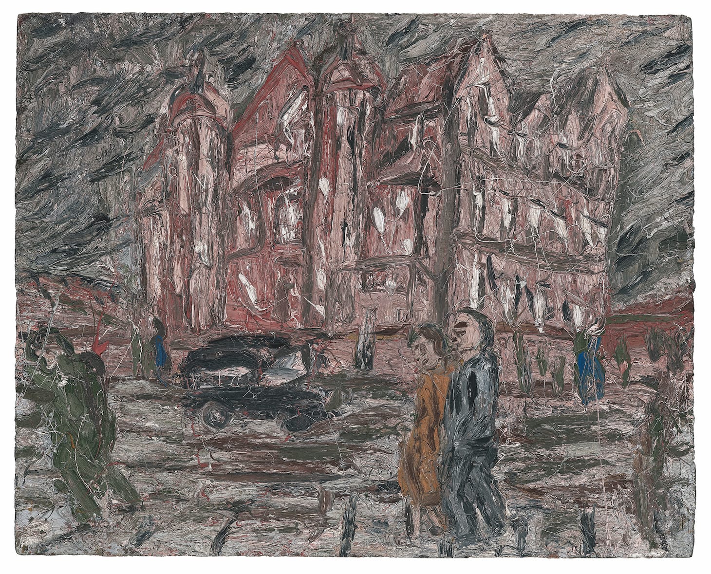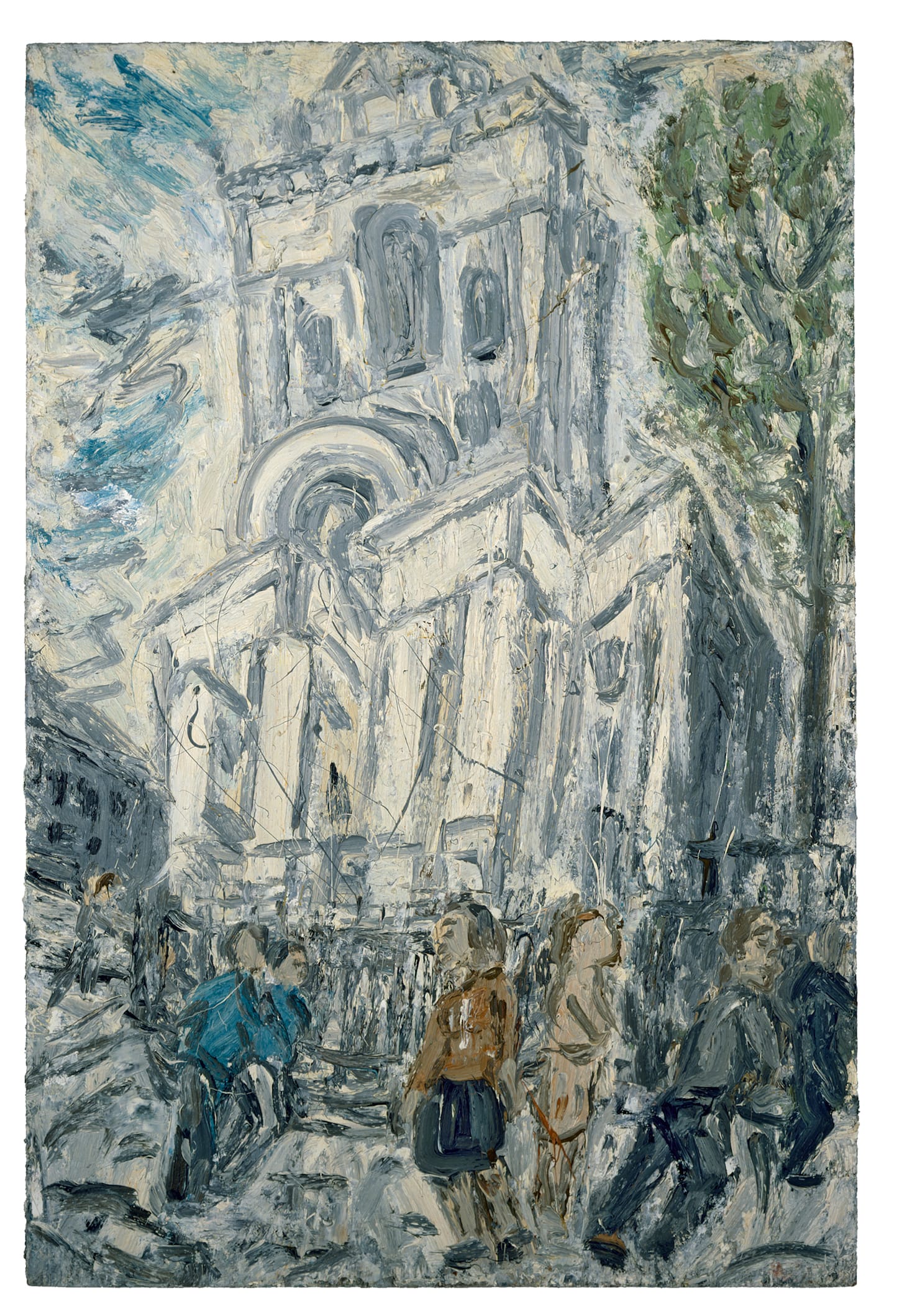 Hawksmoor's great church at Spitalfields was another subject to which he returned again and again. A particularly fine example from that series is one of the highlights of this exhibition, positioned as it is beneath several skylights, which makes it feel at one with the smudgy gray day of scrappily cloudy turbulence you can see if you look up. The painting seems to be sipping at all that light. Kossoff's church lists and leans and bends and bows a little, almost teetering — we may think of Soutine. Human beings pass by in its shadow, with their rapid scissoring walks. Now a new lightness of being seems to have come into play. Kossoff's emburdened spirit is out on the dance floor at last, making its mark. Or marks.